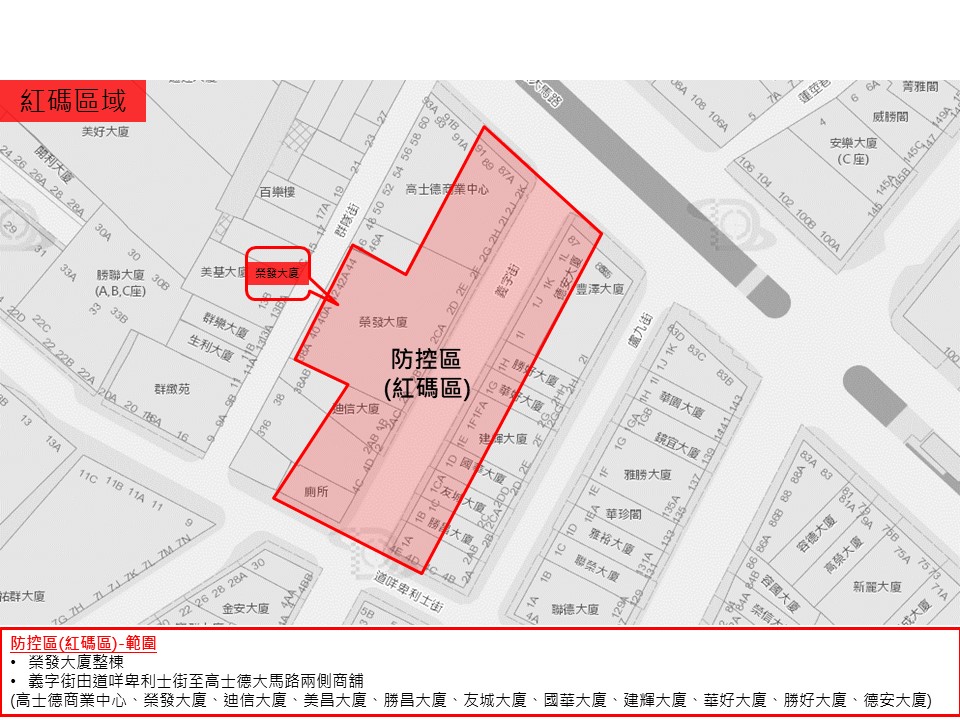 分區分級精準防控方案根據疫點和可能的傳播範圍,劃分為紅碼區(防控區) - - 需實施封閉管理風險最高的區域,及黃碼區(共同管理區) - - 需實施封控管理風險較高的區域。目前,被劃分為紅碼區(防控區)的大廈包括與確診個案的住宅美連大廈和相鄰的輝信大廈、建安樓三幢樓宇,及義字街的相連街舖和榮發大廈列為防控區,需實行全限制封閉式管理,並根據實際情況就地隔離醫學觀察或轉移至適當地點接受集中管理醫學觀察。其他措施包括就地進行核酸檢測,暫時安排在第1、3、5天做核酸檢測。除工作人員外,其餘人士只准進入不准外出,只能最低限度活動,例如在指定地點領取配給品。