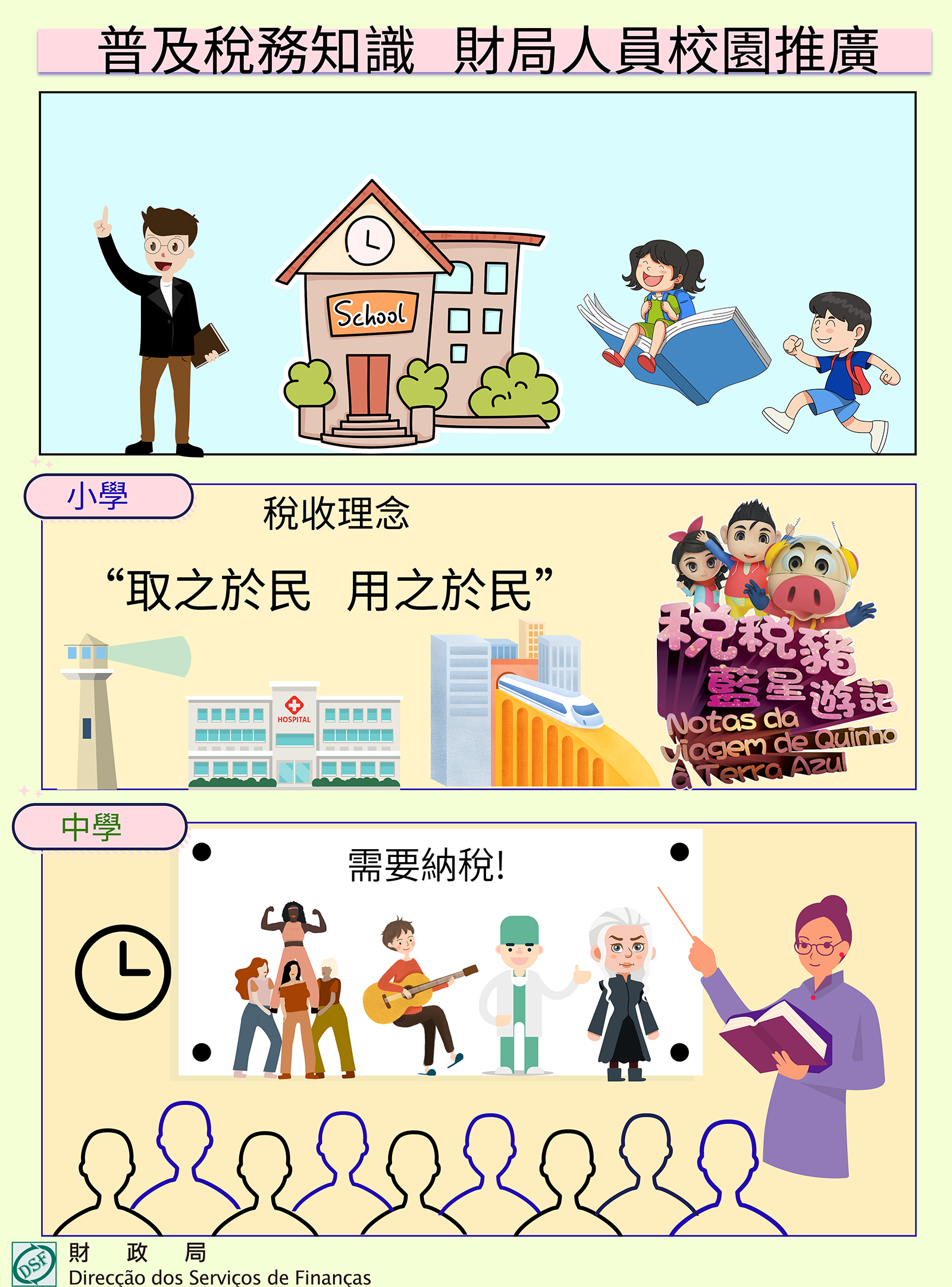 自本年3月起,財政局派員到訪多所學校,小學計有:氹仔中葡學校、鏡平學校、聖善學校、教業中學、明愛學校及中德學校。先是為小學生們播放動畫故事“税税豬藍星遊記”,透過故事寓教於樂,引導他們了解稅收理念是“取之於民,用之於民”,讓其明白報稅納稅是每個澳門市民應盡的公民義務。