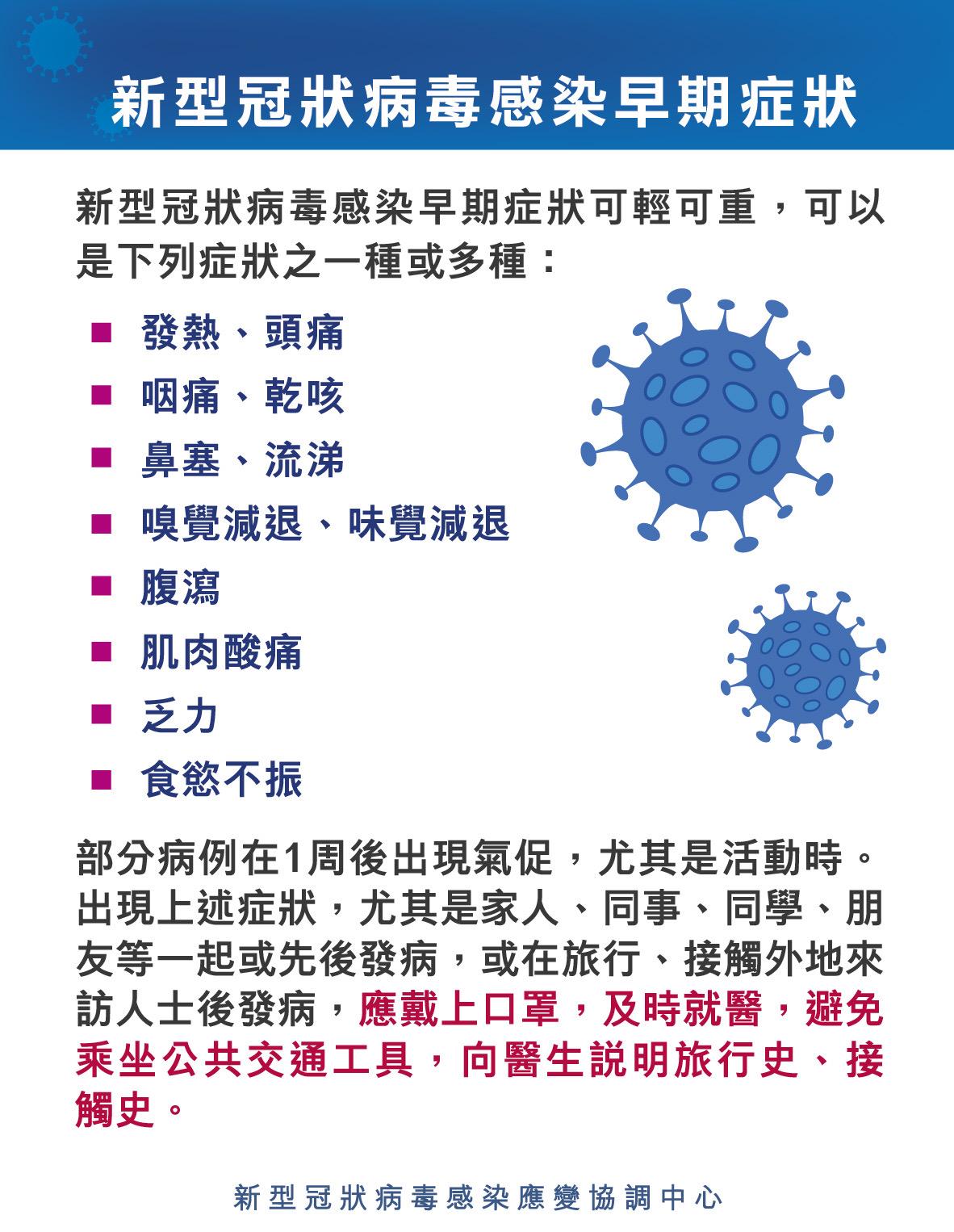 新型冠狀病毒感染應變協調中心提醒市民,新型冠狀病毒感染的早期症狀與一般呼吸道病毒性感染的症狀相似, 因此市民對一些病症需要特別留意。
