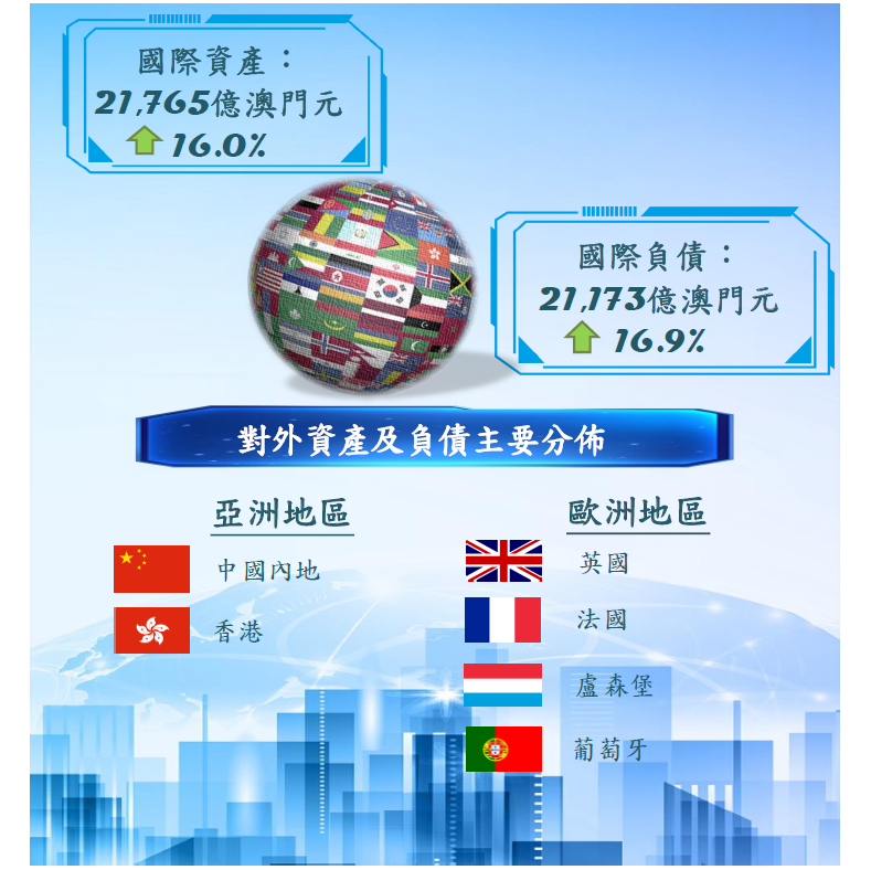 至2021年6月底,澳門銀行的國際資產總額按季上升8.7%,而按年亦增加16.0%,金額為21,765億澳門元(2,722億美元);其中,對外資產按年上升19.7% 至16,818億澳門元,而本地外幣資產亦增長4.9%,金額為4,946億澳門元。作為國際資產主要組成部份的外地非銀行貸款增加19.5%,金額達7,964億澳門元。