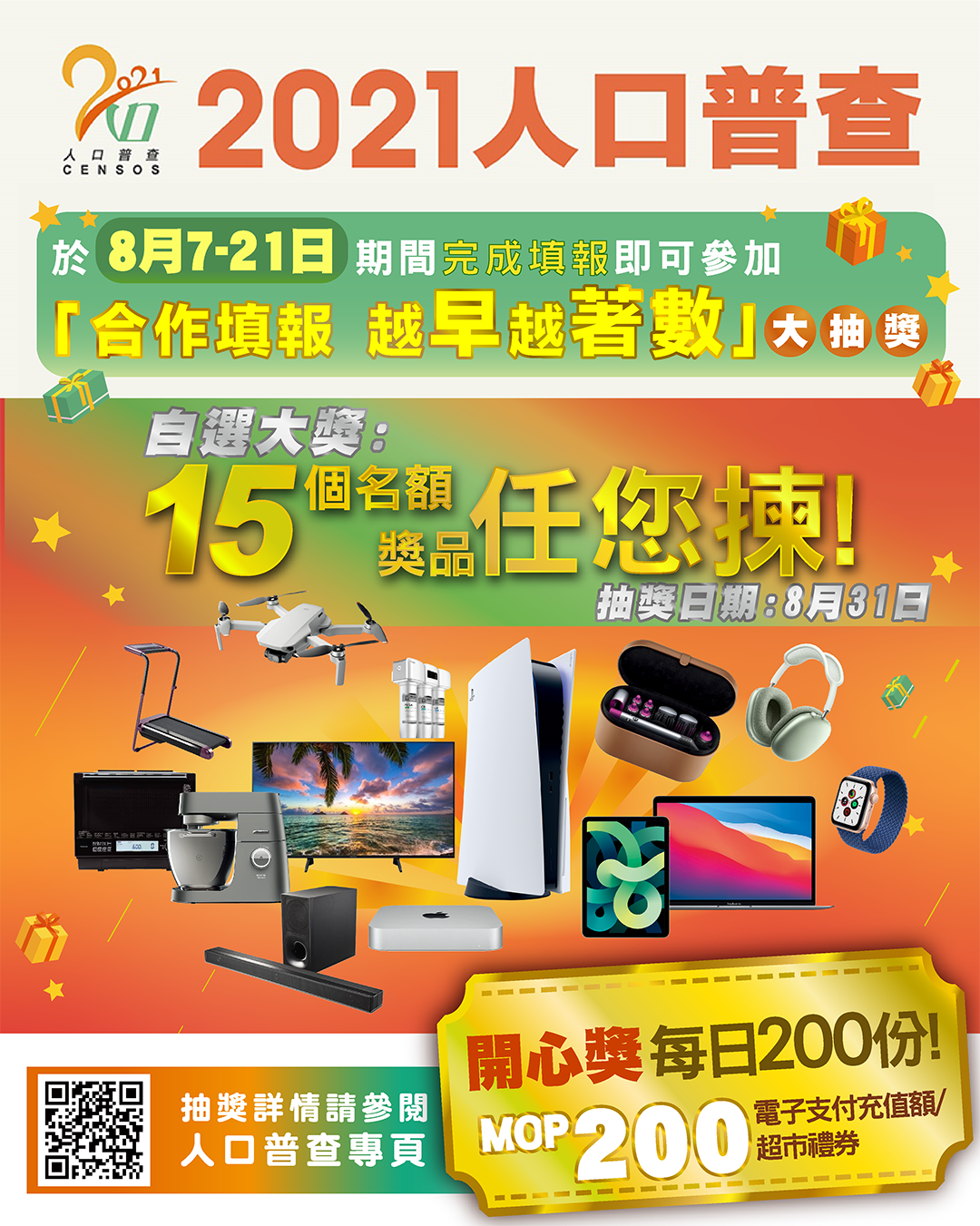 為鼓勵住戶盡早提交問卷,所有完成人口普查問卷的住戶即自動進入 "合作填報,越早越著數!" 抽奬活動,每日抽出200份 "開心奬" ;住戶亦可參加8月31日舉行的 "自選大奬" 抽獎,15個得獎住戶可自由選擇包括新款電腦、新一代遊戲機、傢俱禮劵、智能手錶及音響設備等獎品。此外,為答謝合作住戶的支持和配合,凡完成及提交問卷的住戶均自動進入 "合作住戶大抽獎" ,抽獎日期為9月30日。