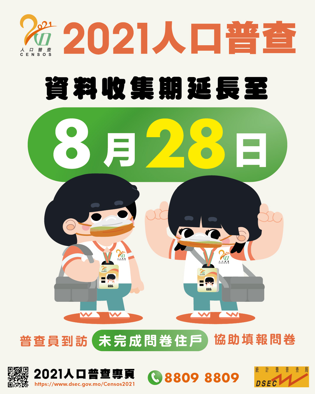 原訂於8月7日至21日進行的2021人口普查資料收集工作,因疫情影響,普查員上門收集資料的工作暫緩,整體回應率受到一定影響。截至8月19日,全澳共有105,000住戶完成人口普查問卷,佔住戶總數50.0%。