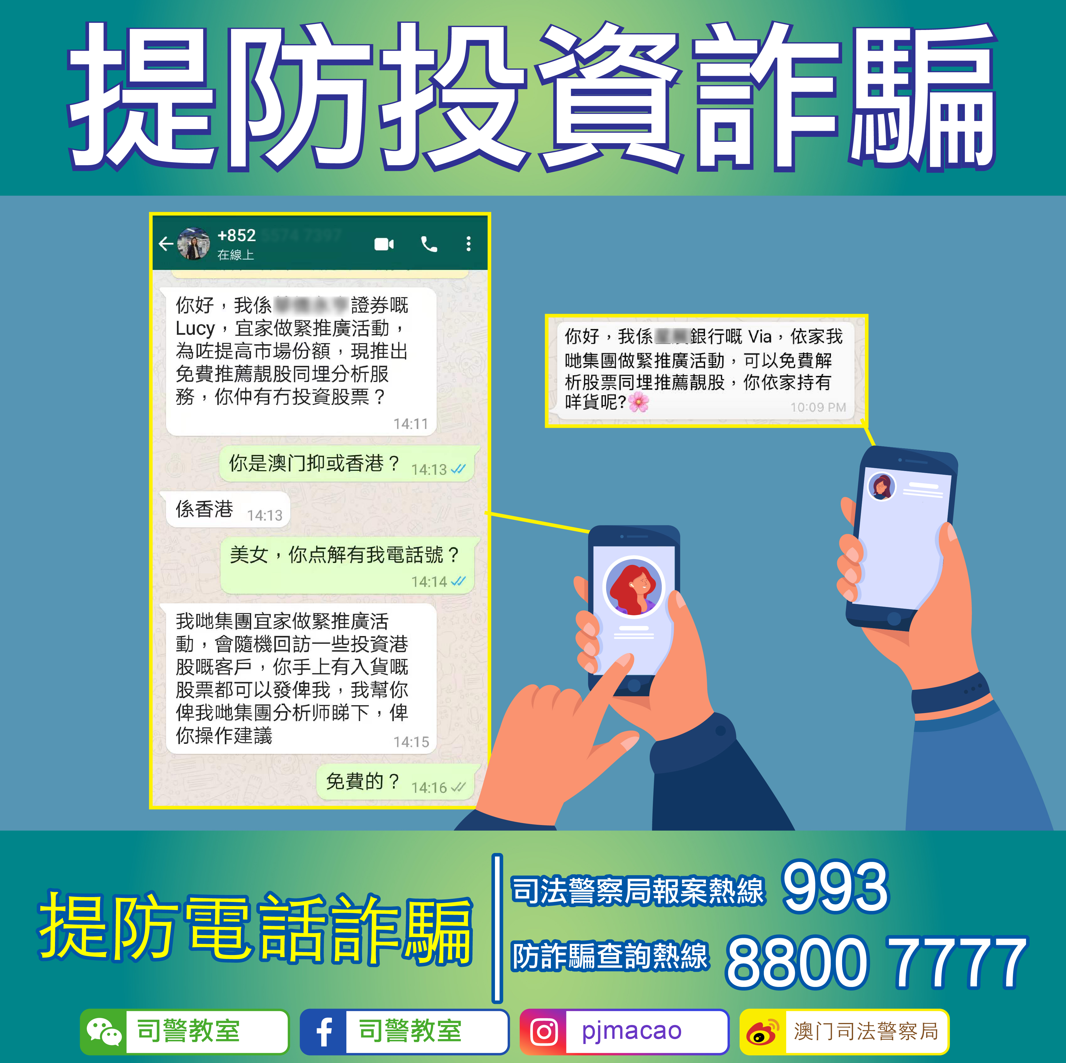 近日司法警察局防詐騙查詢熱線接獲市民反映,表示透過手機通訊軟件接到自稱為某集團證券部職員的陌生人士訊息,對方聲稱該集團近期進行推廣活動,隨機回訪投資港股的客戶,向他們推薦有潛力的股票及免費提供股票投資分析服務。由於近期警方公佈提防投資騙局的防罪訊息,故市民心生警惕,馬上“拉黑”對方並向司警局反映情況。