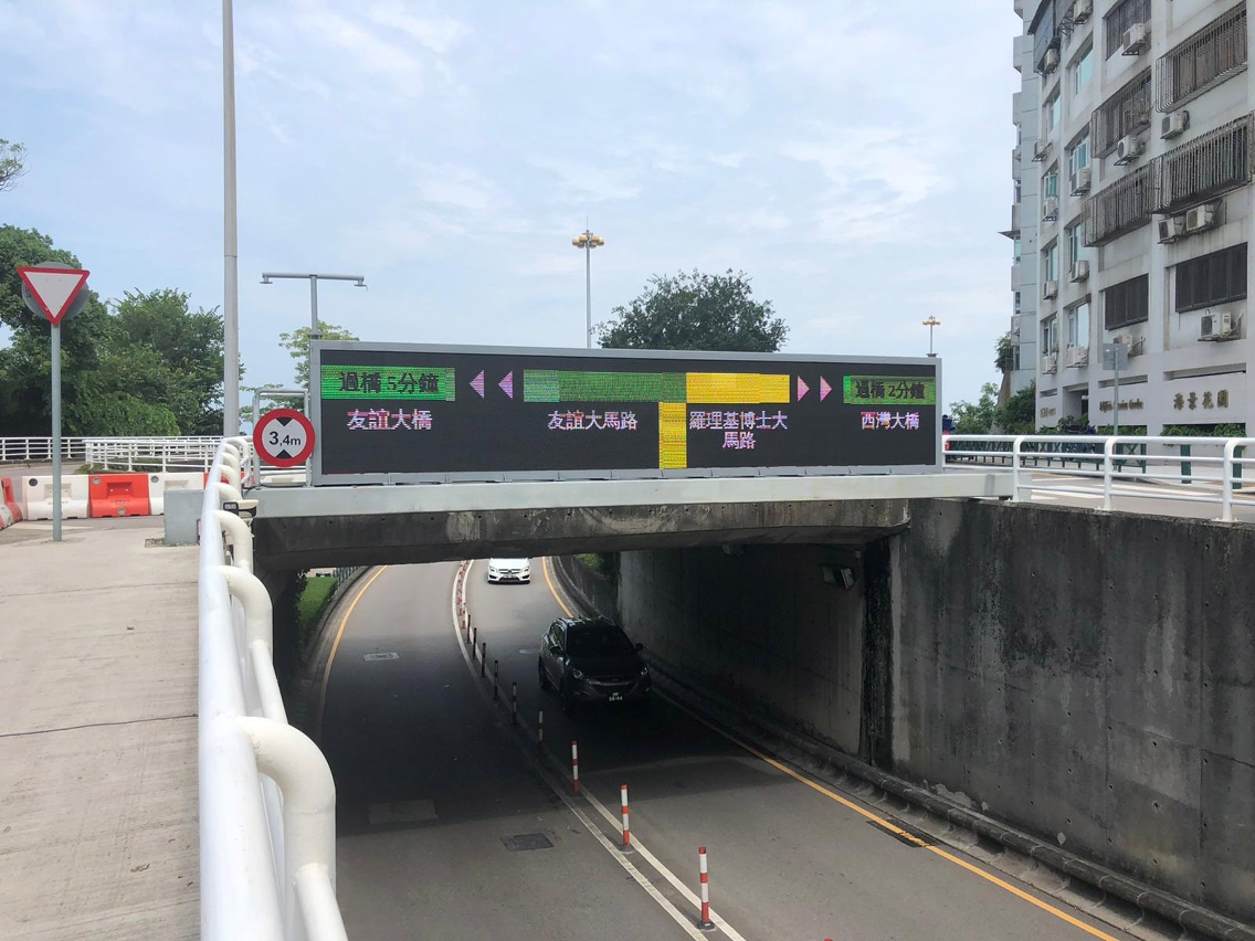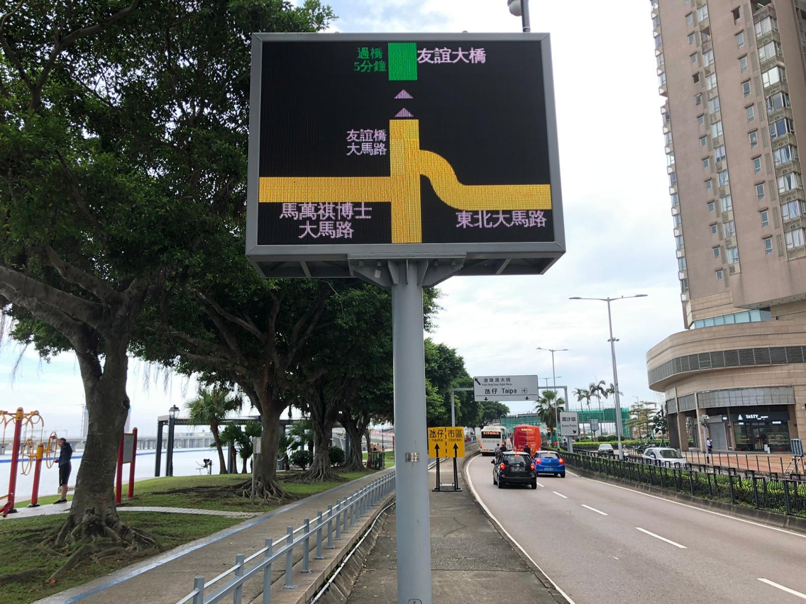 為持續推動智慧交通的應用,交通事務局已在部份道路顯示屏引入實時路況功能,以紅、黃、綠表示道路的擁堵、普通及暢通,並在部分通往大橋前的道路顯示屏加入預計過橋時間,方便市民適當規劃出行。局方早前向交通諮詢委員會的公共運輸服務改善工作小組介紹,並獲認同有關方案。