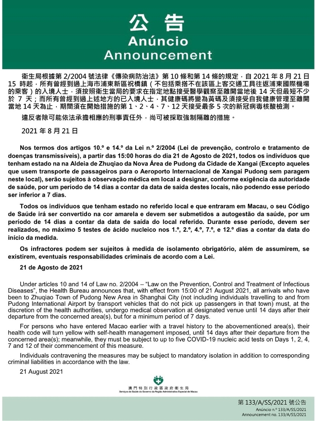 新型冠狀病毒感染應變協調中心宣佈,因應上海市的疫情變化,衛生局根據第2/2004號法律《傳染病防治法》第10條和第14條的規定,自2021年8月21日下午3時起,所有曾經到過上海市浦東新區祝橋鎮(不包括乘搭不在該區上客交通工具往返浦東國際機場的乘客)的入境人士,須按照衛生當局的要求在指定地點接受醫學觀察至離開當地後14天但最短不少於7天;而所有曾經到過上述地方的已入境人士,其健康碼將變為黃碼及須接受自我健康管理至離開當地 14 天為止,期間須在開始措施的第 1、2、4、7、12 天接受最多 5 次的新冠病毒核酸檢測。免費核酸檢測預約連結為https://app.ssm.gov.mo/mandatoryrnatestbook。核酸檢測結果不會上載至澳門健康碼亦不可作為出入境用途。如需將核酸檢測結果在澳門健康碼顯示,則須自費檢測。