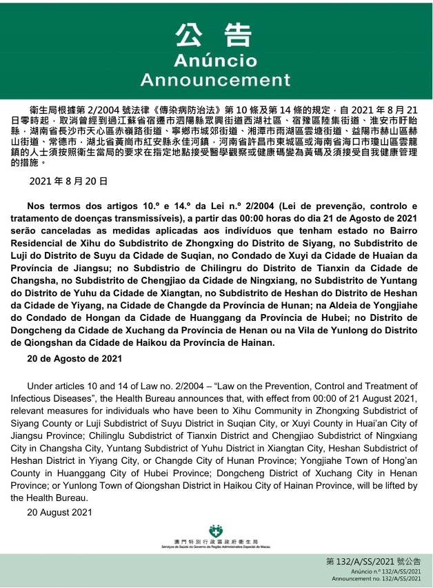 新型冠狀病毒感染應變協調中心宣佈,因應江蘇省、湖南省、湖北省、河南省或海南省的疫情變化,衛生局根據第2/2004號法律《傳染病防治法》第10條和第14條的規定,自2021年8月21日零時起,取消曾經到過江蘇省宿遷市泗陽縣眾興街道西湖社區、宿豫區陸集街道、淮安市盱眙縣,湖南省長沙市天心區赤嶺路街道、寧鄉市城郊街道、湘潭市雨湖區雲塘街道、益陽市赫山區赫山街道、常德市,湖北省黃岡市紅安縣永佳河鎮,河南省許昌市東城區或海南省海口市瓊山區雲龍鎮的人士須按照衛生當局的要求在指定地點接受醫學觀察或健康碼變為黃碼及須接受自我健康管理的措施。
