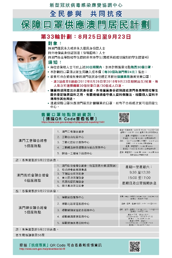 新型冠狀病毒感染應變協調中心今(23)日公佈,第33輪保障口罩供應澳門居民計劃(下稱“口罩計劃”)於周三(25日)開始,售賣期間為30日,即2021年8月25日至9月23日,期間每人可一次性購買30個口罩,售價合共24澳門元。衛生局協議藥房、本澳3個社團(工聯、街總、婦聯)繼續提供售賣口罩服務,即全澳共有72個售賣點,服務時間詳見附圖。透過口罩計劃購買的口罩,如有不合格或次貨可退回衛生中心。