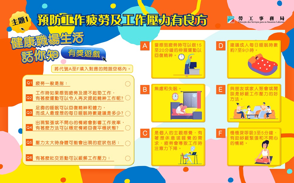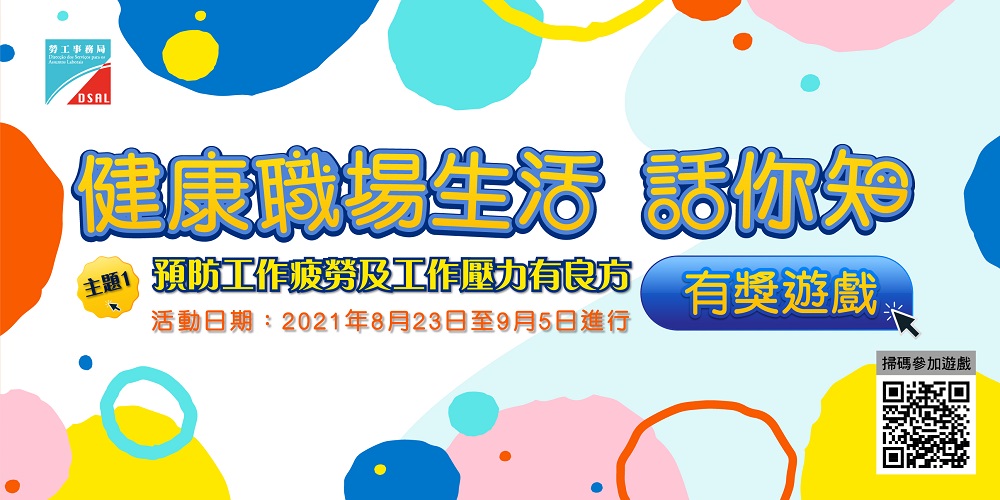 勞工局舉辦以職業健康為主題的“健康職場生活話你知”有獎遊戲,希望透過有獎遊戲活動,向大眾普及職業健康的知識,提升大眾對職業健康的關注。第一期遊戲由即日開始,歡迎有興趣參加的市民透過勞工局網頁www.dsal.gov.mo、勞工局手機應用程式或掃描二維碼直接參與有獎遊戲。