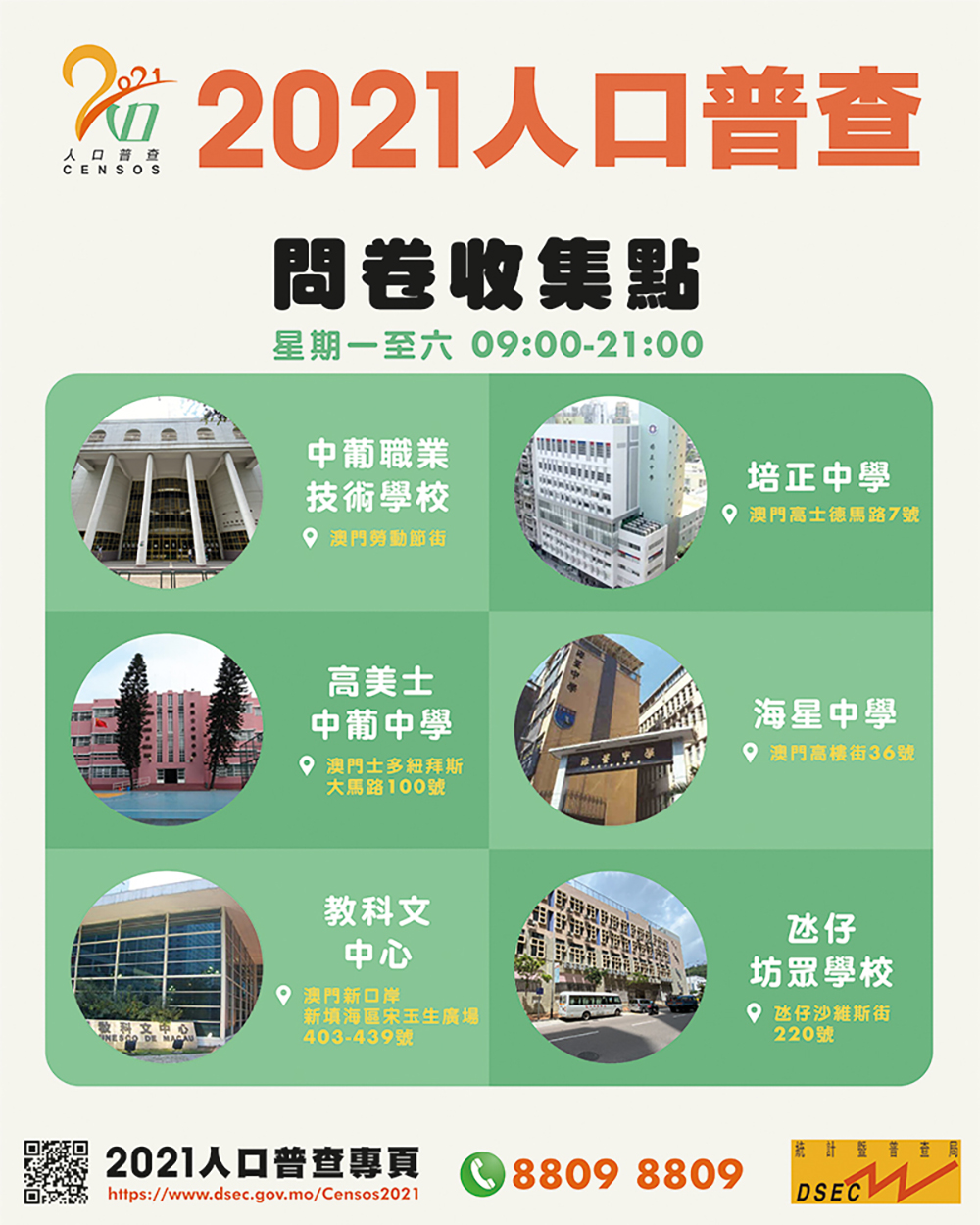 統計局呼籲全澳市民配合普查工作,履行公民責任,為澳門未來發展提供準確資料。有關人口普查詳情,請瀏覽2021人口普查專頁( https://www.dsec.gov.mo/Censos2021 ),或致電人口普查熱線8809 8809查詢。