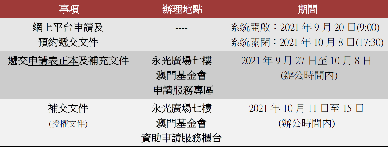 各申請者去年已開始通過澳門基金會網上資助申請平台提交申請,順利過渡至電子化申報。未有開立網上帳戶而有意提出資助申請者,敬請儘快申請開立帳戶。是次“2022年文化項目資助計劃”申請,澳基會受理已開通帳戶的申請者,於9月20日至10月8日期間通過網上平台申報申請資料,並以預約方式於9月27日至10月8日期間按照已預約之時間親臨澳基會特設的申請服務專區遞交申請表正本及其他所需補充文件。澳基會強調,所有2022年的上述四類項目資助申請必須按上述期限提出,逾期將不再受理。