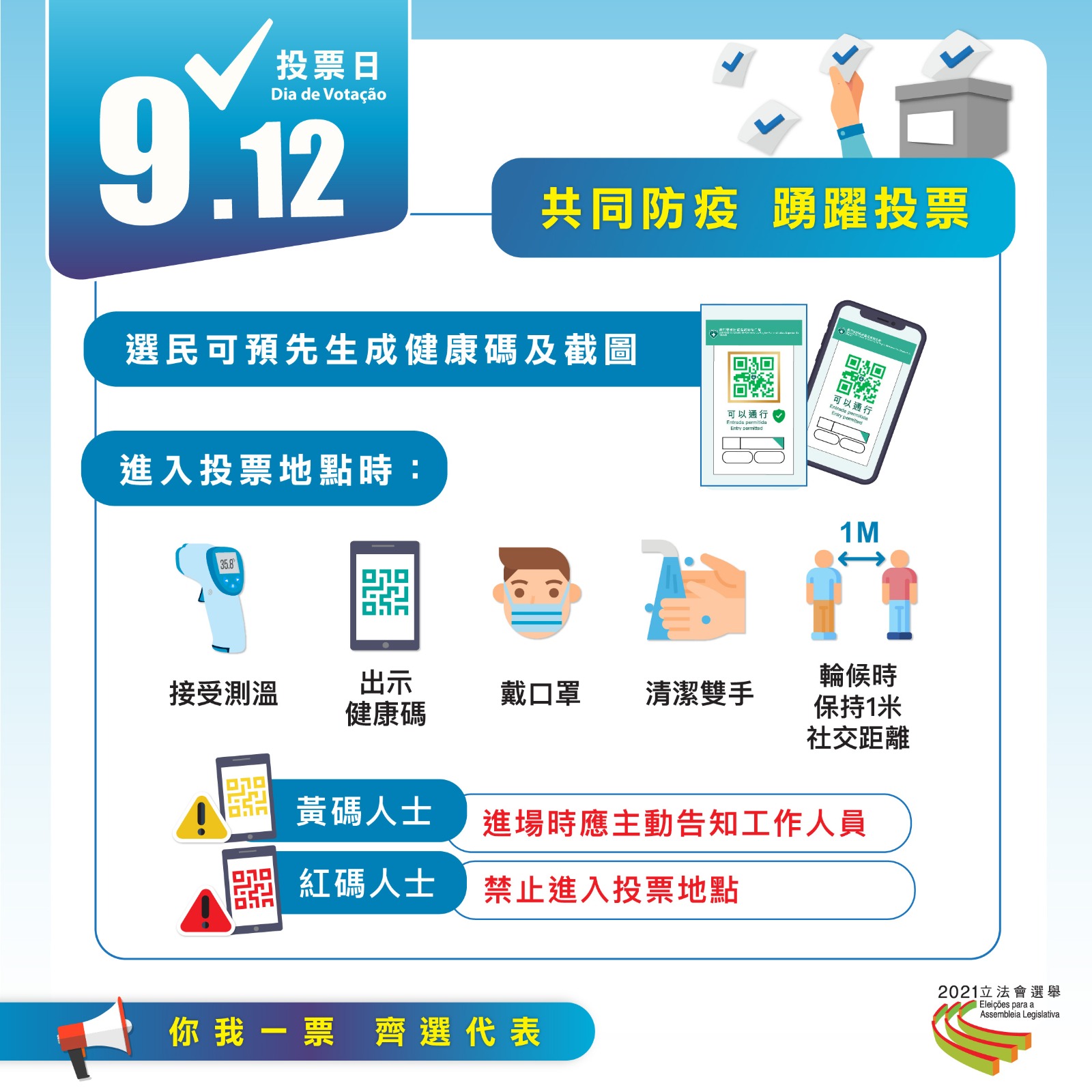 除出示健康碼,選民進入投票地點前還需接受測溫,入口處亦有消毒用品供選民清潔雙手。如需在投票地點的輪候區等候進入投票站,以及在投票站內,選民都應按現場設有的1米距離標示,與他人保持適當社交距離。完成投票後儘快離開,勿停留和聚集,票站出口亦有提供消毒用品,請選民善加使用。