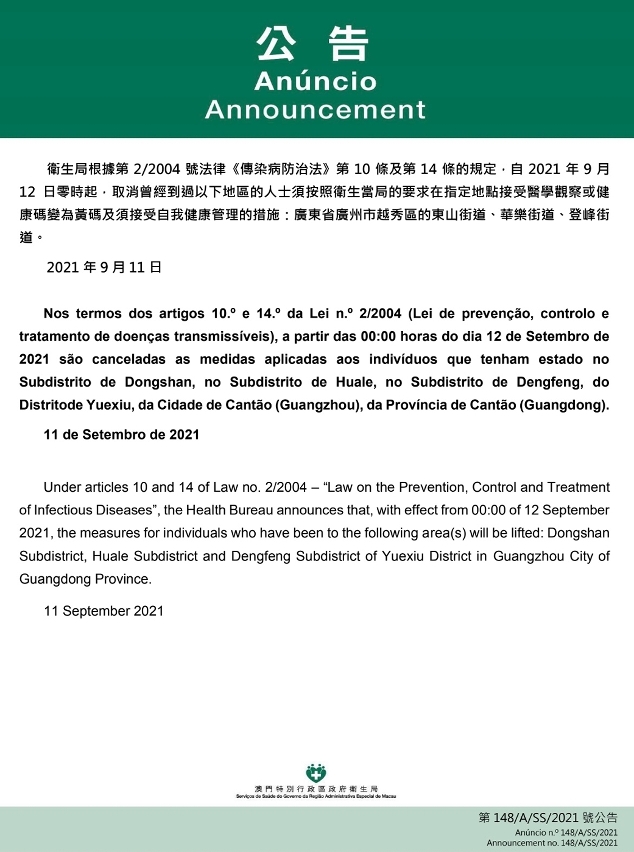 新型冠狀病毒感染應變協調中心宣佈,因應廣東省的疫情變化,衛生局根據第2/2004號法律《傳染病防治法》第10條和第14條的規定,自2021年9月12日零時起,取消曾經到過以下地區的人士須按照衛生當局的要求在指定地點接受醫學觀察或健康碼變為黃碼及須接受自我健康管理的措施:廣東省廣州市越秀區的東山街道、華樂街道、登峰街道。