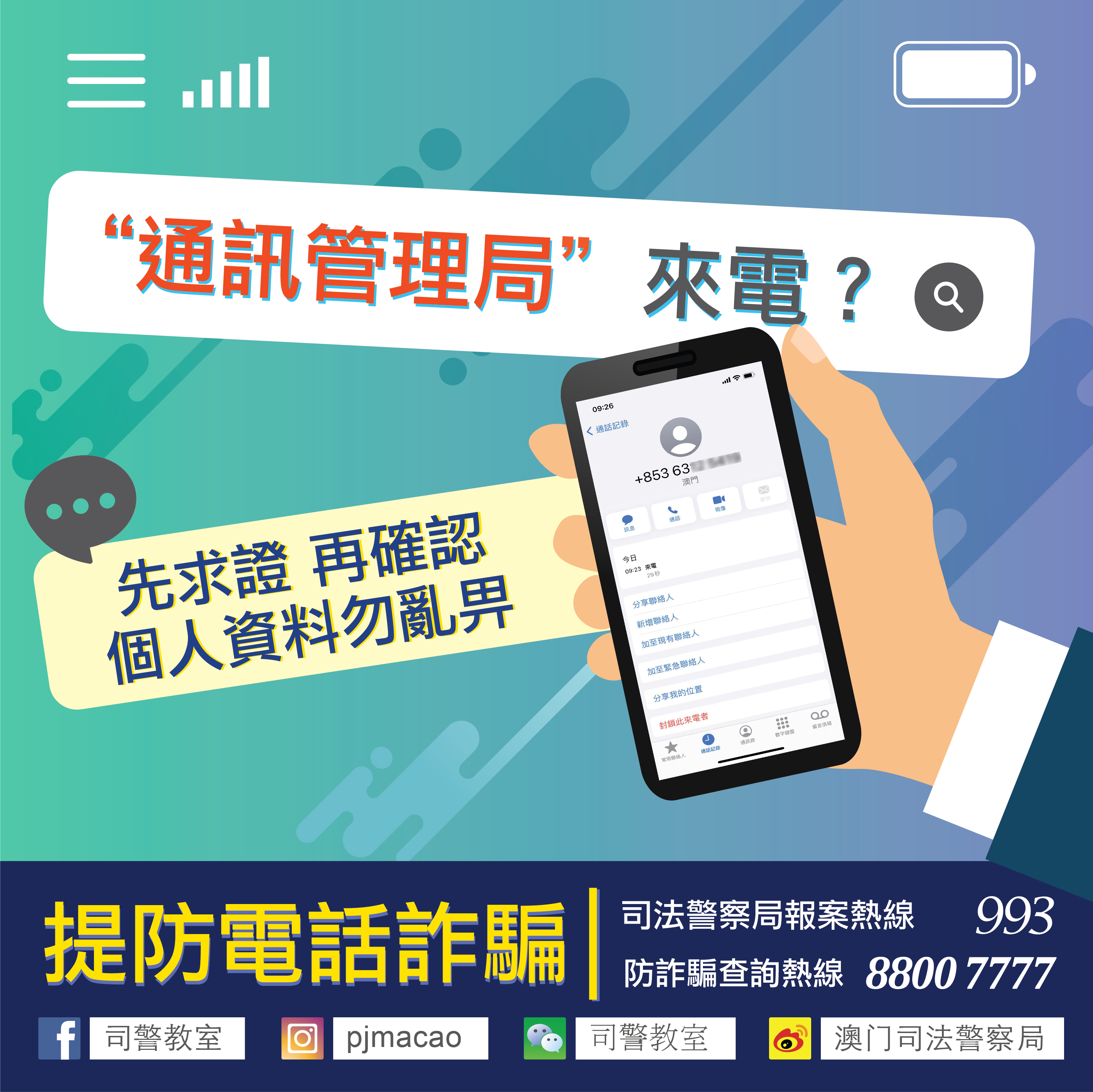 近日司法警察局接獲“司警局婦女防罪之友”會員反映,指其手機接到一通顯示為本澳手機號碼的廣東話語音電話,內容自稱是“通訊管理局”來電,指事主手機出現異常,將被停機,並着其按“2”字查詢詳情。該名會員察覺事件有可疑,立刻掛線並向司警局作出舉報。