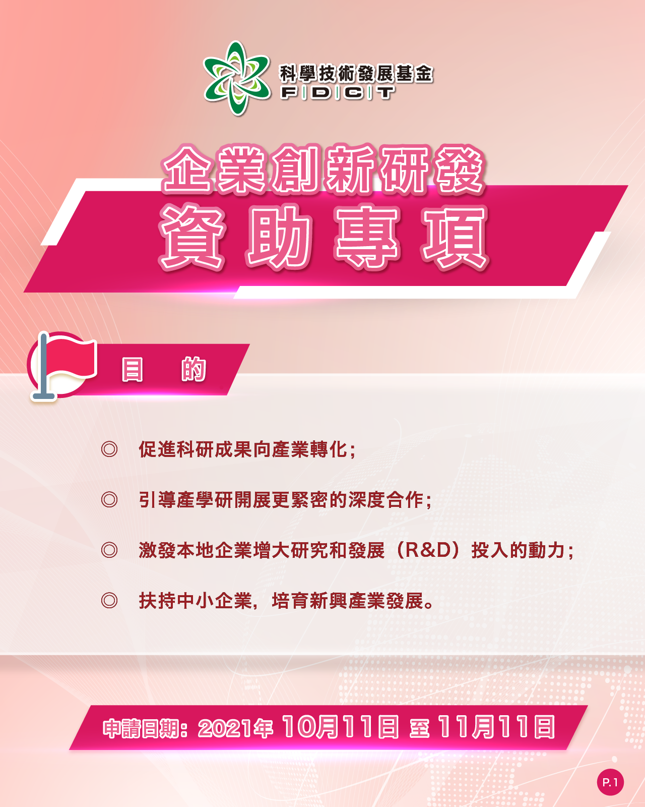 企業創新研發資助專項,目的是支持中小企業科技創新研發,培育新興產業發展,營造企業研發氛圍,鼓勵企業進行創新研發及科研成果轉化。專項擬定每年接受申請,本年申請定於10月11日至11月11日。
