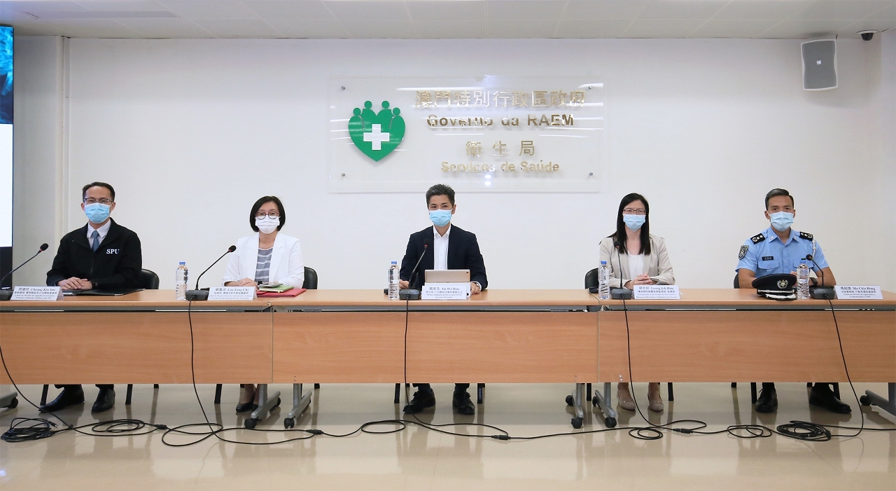新型冠狀病毒感染應變協調中心(下稱應變協調中心)於今(29)日舉行記者會,仁伯爵綜合醫院戴華浩醫務主任、旅遊局傳播及對外關係廳劉鳳池廳長、警察總局警務聯絡及公共關係處張健欣處長、治安警察局行動及通訊處馬超雄處長、疾病預防控制中心傳染病防制暨疾病監測部梁亦好協調員共同會見傳媒。