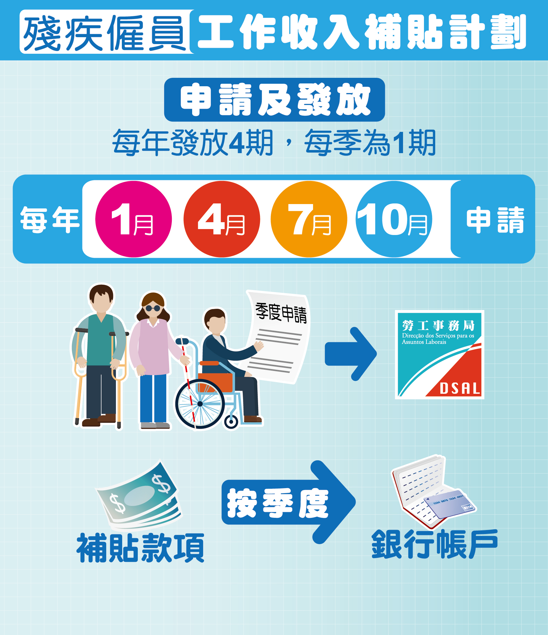市民除可在勞工局各辦事處、社會工作局各辦事處及社會保障基金索取申請表格外,還可於勞工事務局網頁 https://www.dsal.gov.mo/zh_tw/standard/disability_income_subsidy.html 下載表格,並將填妥的申請表格連同所需文件可遞交至勞工事務局各辦事處。如對上述計劃的申請有任何查詢,可瀏覽該局網頁 www.dsal.gov.mo 或致電28700277及66329329查詢。