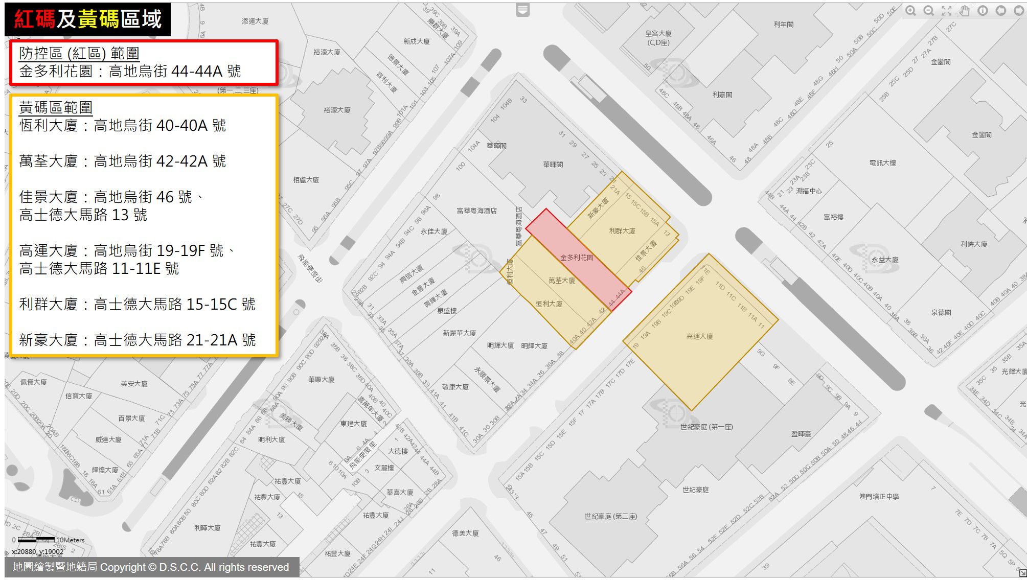 新增紅碼區範圍包括:高地烏街44-44A號金多利花園、澳門商業大馬路251-291英皇娛樂酒店、拱形馬路/關閘橫路118號維多利亞酒店。管制措施包括就地進行核酸檢測,及後每日做核酸檢測,除工作人員外,其餘人士只准進入不准外出,只能最低限度活動,例如在指定地點領取配給品;實行全限制封閉式管理,並根據實際情況就地隔離醫學觀察或轉移至適當地點接受集中管理醫學觀察。