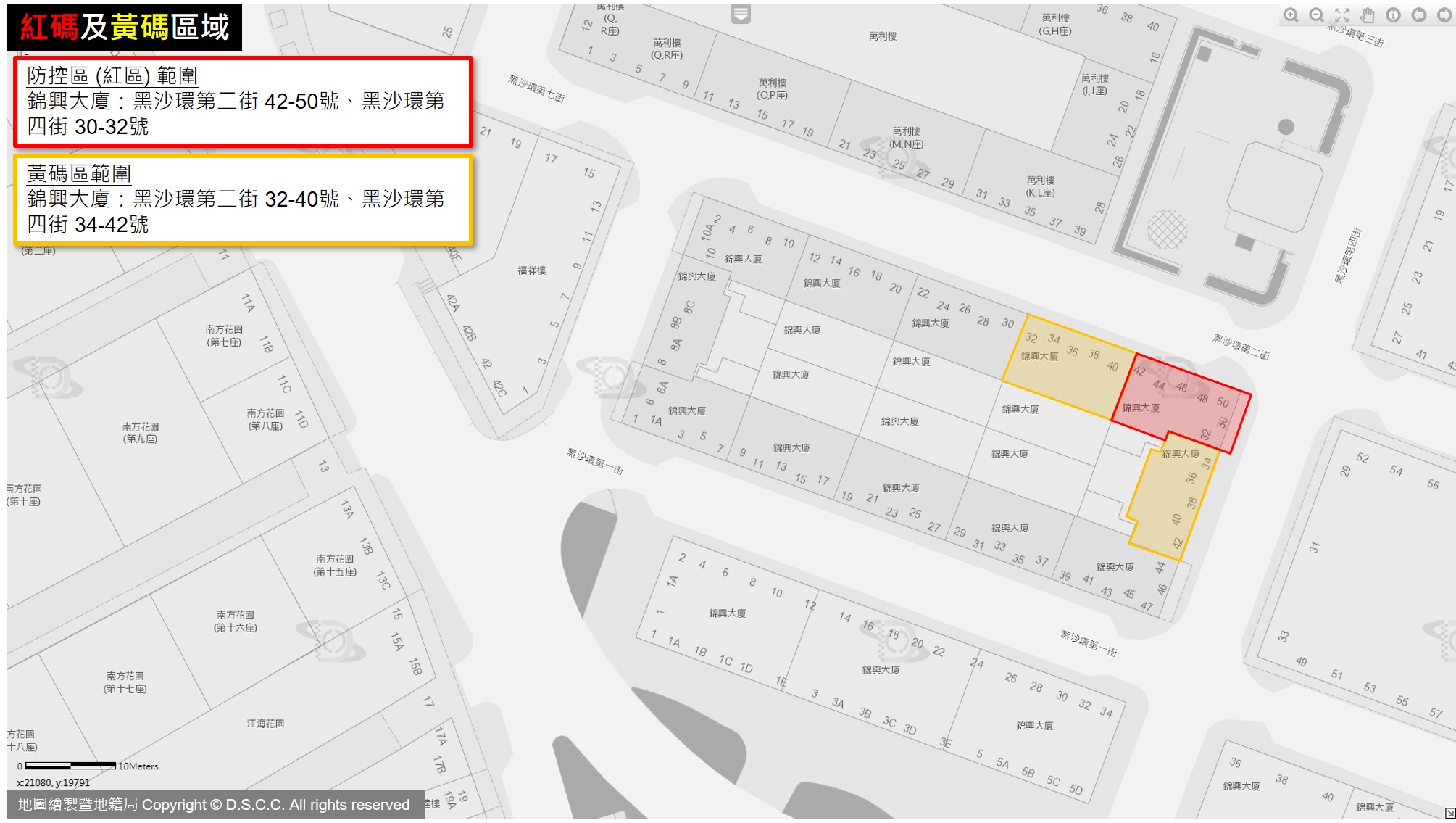 新增紅碼區範圍:黑沙環第二街 42-50號、黑沙環第四街 30-32號錦興大廈,管制措施包括就地進行核酸檢測,及後每日做核酸檢測,除工作人員外,其餘人士只准進入不准外出,只能最低限度活動,例如在指定地點領取配給品;實行全限制封閉式管理,並根據實際情況就地隔離醫學觀察或轉移至適當地點接受集中管理醫學觀察。