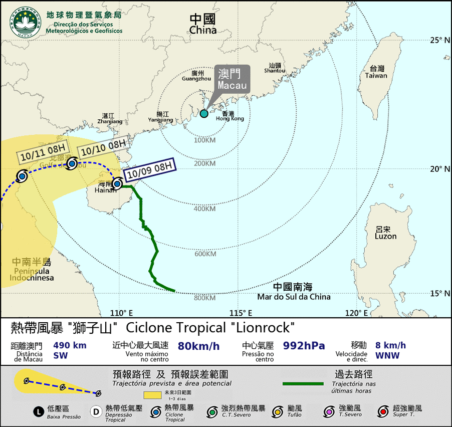 八號東南風球現正生效。於早上9時,熱帶風暴「獅子山」集結在本澳西南約 490 公里,大致趨向北部灣。由於「獅子山」路徑比預期偏北,且與東北季風的共同效應比預期明顯,本澳早上風力會有所增強,預料相關烈風區今早會間歇影響本澳,最大風力達7至8級,並有頻密大驟雨及雷暴。