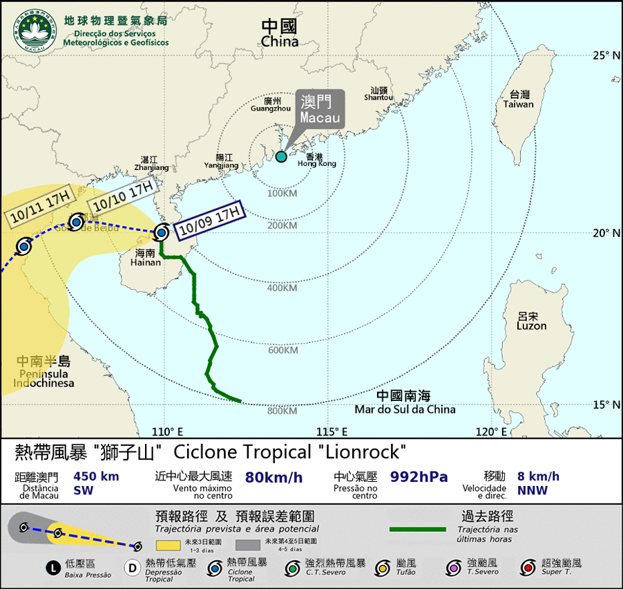 八號東南風球仍然生效。於下午5時,熱帶風暴「獅子山」集結在本澳西南約450 公里,將進入北部灣。但由於「獅子山」與東北季風共伴效應造成的強雨區仍持續影響珠江口,本澳風力間中仍達7至8級。8號東南風球將維持一段時間。預料今晚至明日初時本澳天氣仍然不穩定,間中有大驟雨及雷暴。