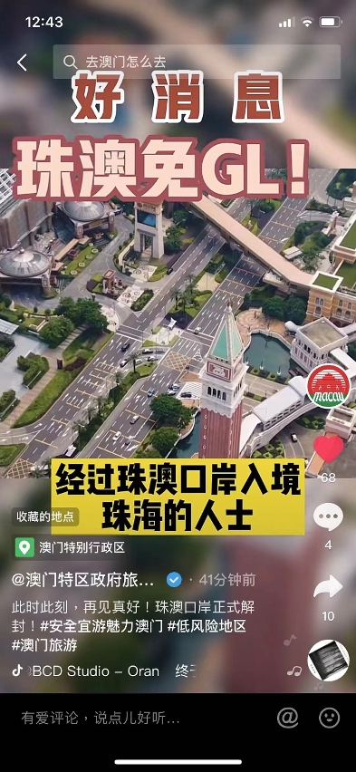 自2021年10月19日中午12時起,經珠澳口岸出境人士,需持48小時內核酸檢測陰性結果證明。旅遊局在官方社交媒體發佈短視頻,向外宣傳澳門通關現況及最新旅遊資訊,又透過澳門網紅,在其抖音及小紅書平台作多角度宣傳,加強推廣澳門旅遊。
