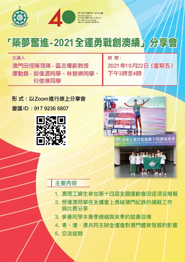 為讓學生及大眾了解大型體育比賽的備戰工作和比賽的應對方法,澳門理工學院健康科學及體育高等學校將於2021年10月22日舉辦“澳門理工學院四十週年校慶活動:‘築夢奮進-2021全運勇戰創澳績’分享會”, 歡迎各界人士參與。