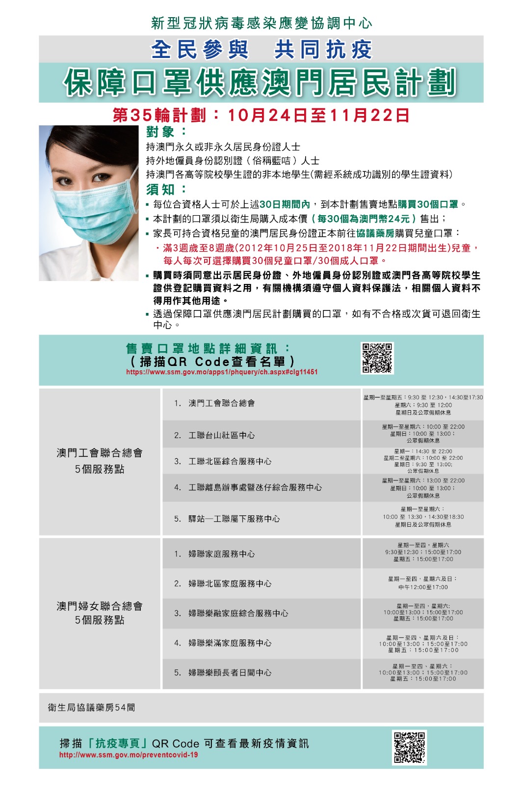 新型冠狀病毒感染應變協調中心公佈,第35輪保障口罩供應澳門居民計劃於周日(10月24日)開始,售賣期間為30日,即10月24日至11月22日,期間每人可一次性購買30個口罩,售價合共24澳門元。售賣方式、地點和時間不變。