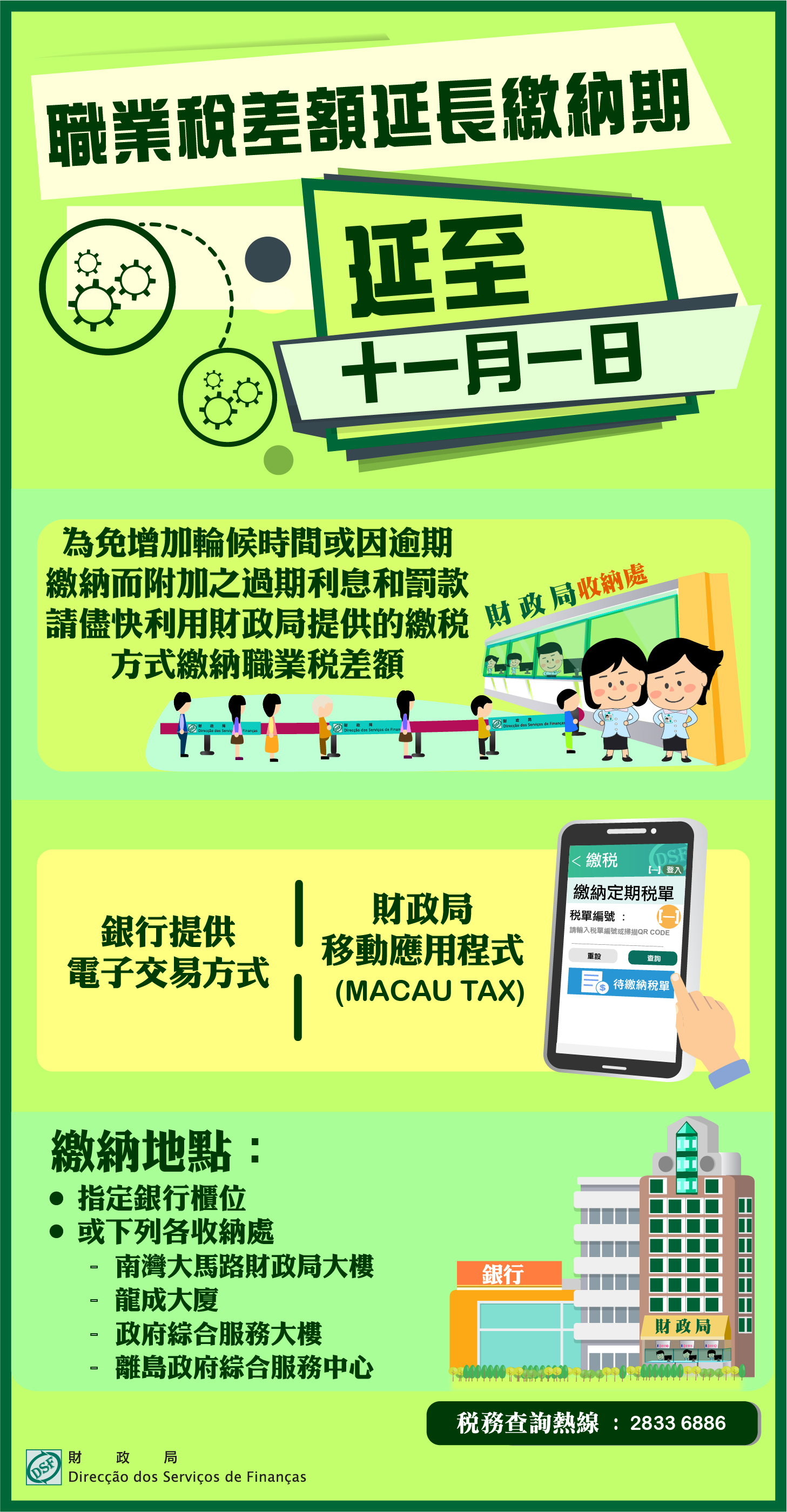 鑑於十月三十一日為星期日,職業稅2020年度差額之最後繳納期限延至十一月一日(星期一)。為免增加輪候時間或因逾期繳納而附加之過期利息和罰款,財政局呼籲倘仍未繳納上述職業稅差額之納稅人,請儘快利用財政局提供的繳稅方式繳納。亦可於辦公時間內,到指定銀行櫃位,以及透過銀行提供電子交易方式。另外,可使用財政局移動應用程式(MACAU TAX)掃瞄徵稅憑單上之二維碼,利用有關移動支付平台繳交稅款,或於財政局大樓、龍成大廈、政府綜合服務大樓及離島政府綜合服務中心收納處繳交。