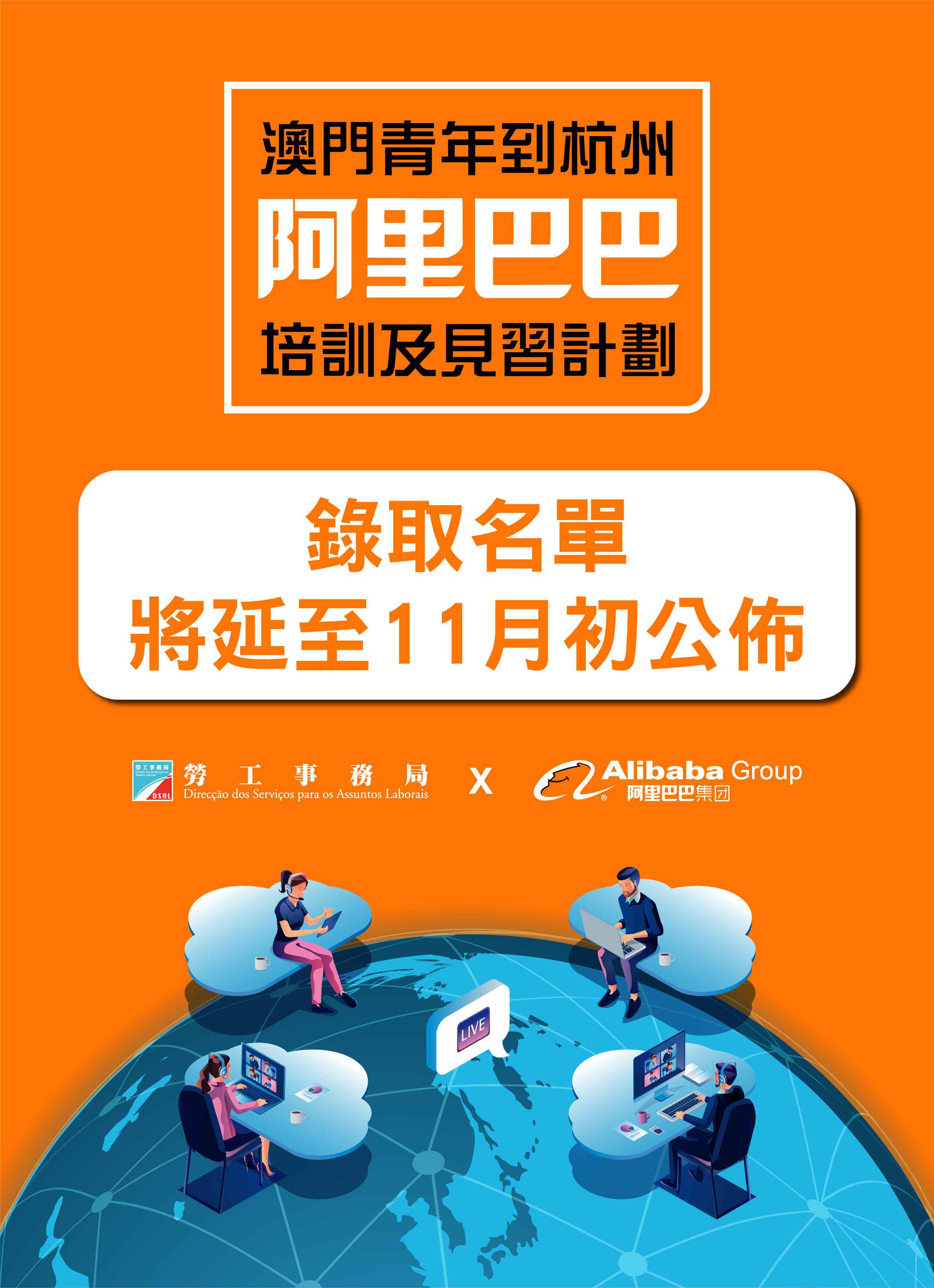由於10月份本澳新冠肺炎疫情出現變化,導致“澳門青年到杭州阿里巴巴培訓及見習計劃”面試甄選工作延後,有關錄取名單將延至11月初公佈。