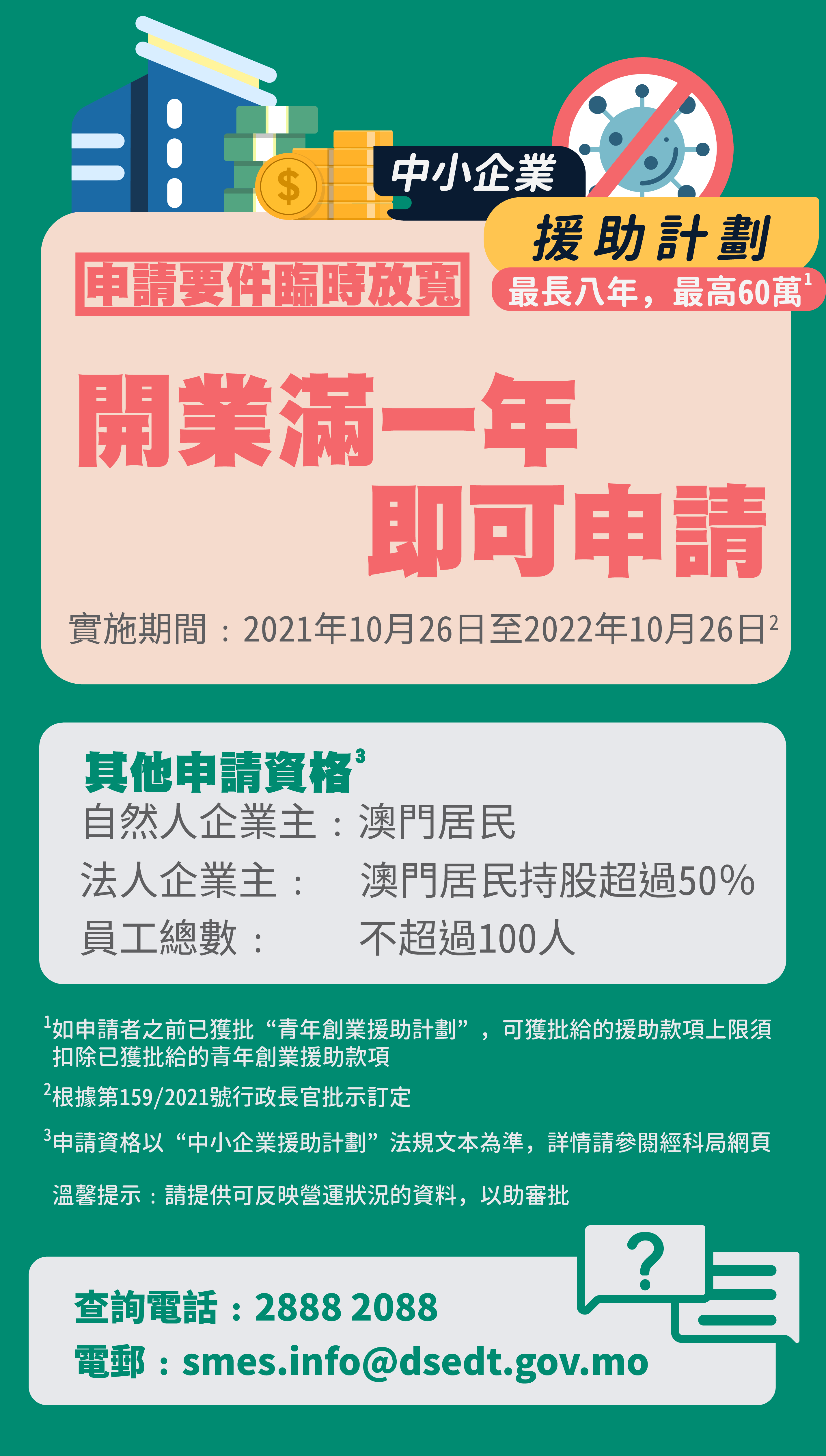 “中小企業援助計劃”的申請條件已臨時放寬,營業已滿一年且符合其他資格的中小企業今(26)日起,可向經科局申請最高60萬澳門元、最長還款期8年的免息貸款。臨時放寬措施的實施期為12個月,至2022年10月26日結束。