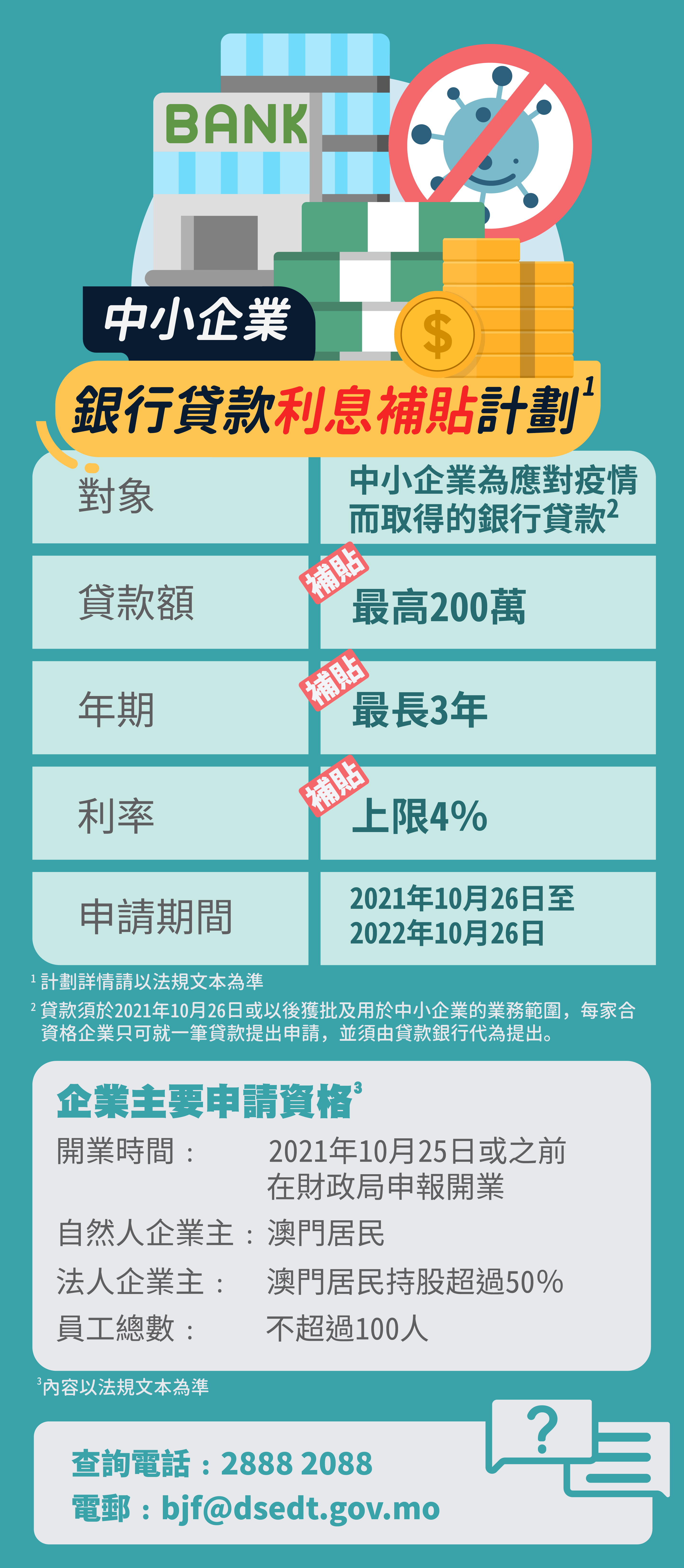 此外,符合資格的澳門中小企業,如於今(26)日起計12個月內獲得澳門銀行批出一筆用於應對新冠疫情的貸款,可根據“中小企業銀行貸款利息補貼計劃”申請利息補貼,貸款額上限為200萬澳門元,補貼期最長為三年,年補貼率上限為四厘。計劃需透過銀行申請,申請期至2022年10月26日結束。