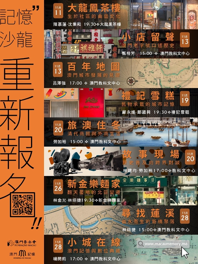 是次活動由澳門基金會開展的“澳門記憶”主辦,當中,“老字號對談”分享會將聯乘本澳的“老字號”店舖之店主,就社區與小城記憶展開三個領域(曲藝文化、舊物憶記、城市規劃)的深度交流,藉以進一步推動“澳門記憶”走進社區,讓參加者加深對社區發展與行業蛻變的了解;六場主題座談則為深受師生喜愛的“校園講座”之延伸,除了分享“百年地圖”、“清代商貿”、“尋找蓮溪”等主題的精彩內容,還邀請到“記憶傳說”製作人到場交流故事詮釋的技巧,以及透過“澳門老字號口述歷史”的個案喚起參加者的集體回憶,藉此回顧並認識更多小城店舖、區域發展的故事。