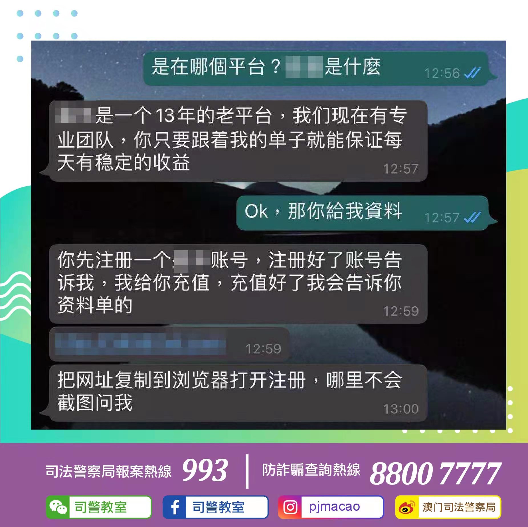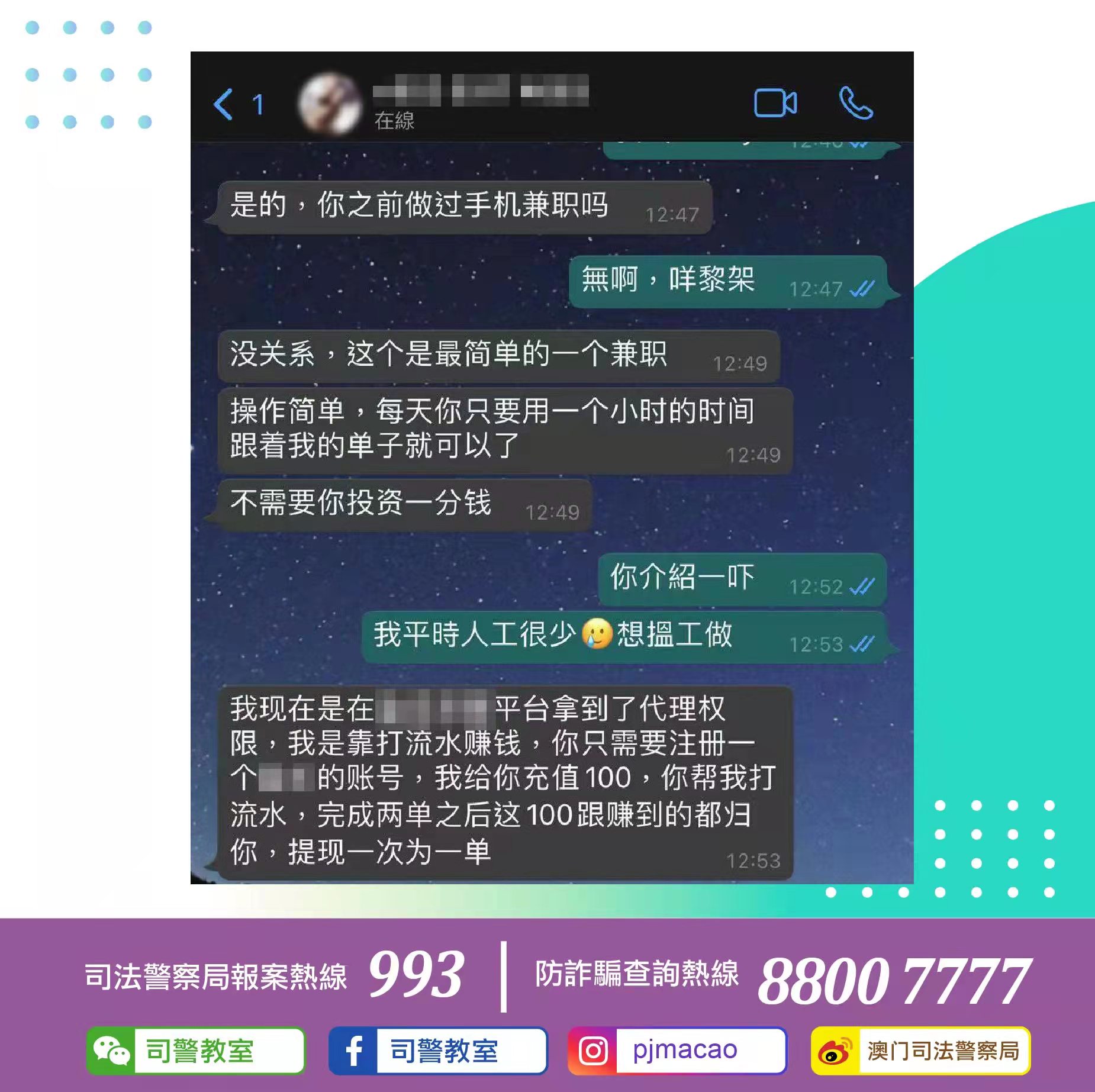 近日司法警察局再次接獲市民舉報,指其透過手機通訊軟件接到陌生人士傳來有關招聘兼職的訊息,並附有網站連結,事主點擊連結後獲對方加為好友;對方聲稱拿到某網絡彩票平台的代理權限,可以通過“打流水”賺錢,又慫恿事主點擊另一網站連結並在該平台注冊帳號,亦以金錢誘使其參與該活動,更以“每天工作時間短”和“可獲穩定收益”作為招徠。事主懷疑此為網絡詐騙手法,故馬上拉黑對方並告知司警局。
