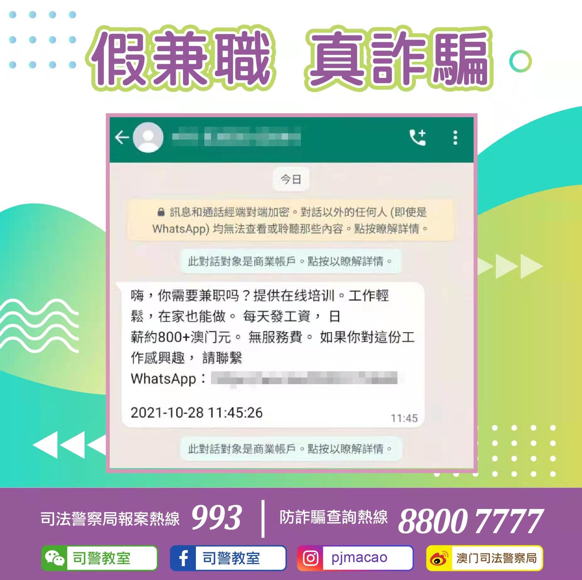 經司警局調查,證實有關訊息實為虛假招聘廣告,騙徒假借招聘之名,引誘市民點擊有關連結參與網上博彩。由於司警局於上月曾發出警情通告提醒市民防範這類詐騙手法,故再次呼籲市民須提高防騙警覺,倘若收到陌生人傳送訊息,應小心求證相關內容真偽,切勿點擊來歷不明的連結或提供個人資料。