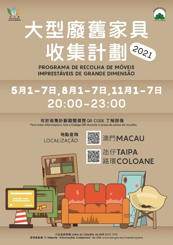 為方便市民棄置大型廢舊家具,市政署將於11月1日至7日期間,晚上8時至11時,於本澳各區設置60個臨時大型廢舊家具收集站。市政署提醒市民棄置時應注意擺放位置,避免影響行人及交通安全。