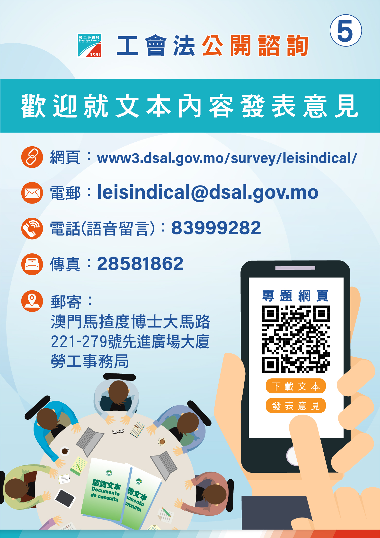 除公眾諮詢會外,市民亦可於諮詢期內,透過專題網頁、電郵、電話、傳真或郵寄等方式發表意見及建議。欲了解更多關於公眾諮詢的詳情,請瀏覽勞工事務局的專題網頁。