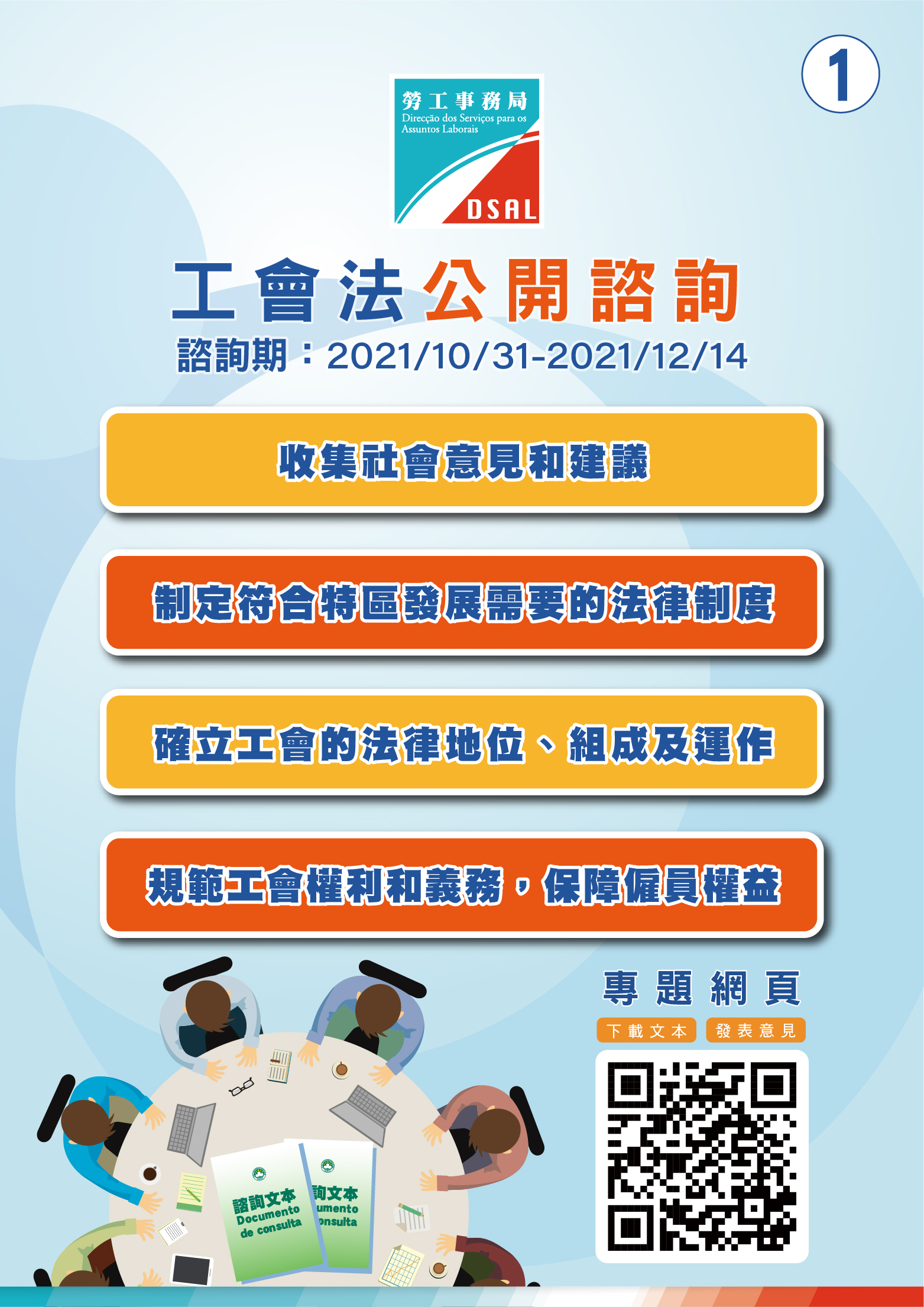 為聽取社會各界對“工會法"諮詢文本的意見及建議,勞工事務局將於諮詢期內,於澳門友誼大馬路918號世貿中心五樓蓮花廳舉辦4場公眾諮詢會。諮詢會以中文為主,並備有中葡傳譯服務。諮詢會具體場次及安排如下︰