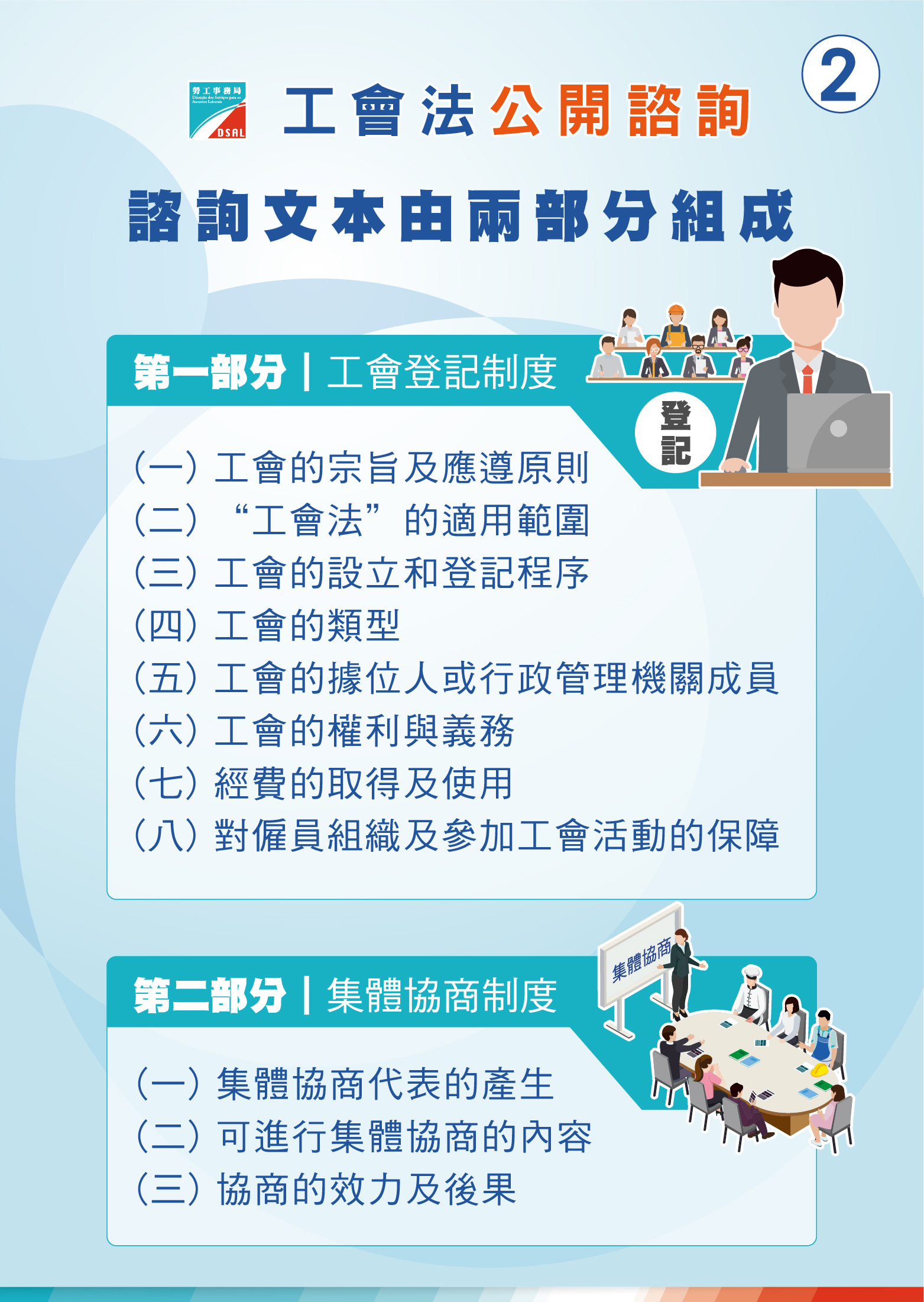 是次的諮詢文本由兩部分組成。第一部分是工會登記制度,內容包括:(一)工會的宗旨及應遵原則;(二)“工會法”的適用範圍;(三)工會的設立和登記程序;(四)工會的類型;(五)工會的據位人或行政管理機關成員;(六)工會的權利與義務;(七)經費的取得及使用;(八)對僱員組織及參加工會活動的保障。第二部分是集體協商制度,內容包括:(一)集體協商代表的產生;(二)可進行集體協商的內容;(三)協商的效力及後果。