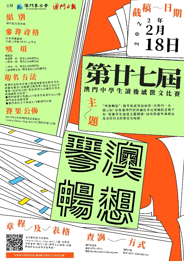 由澳門基金會、澳門日報合辦的“第廿七屆澳門中學生讀後感徵文比賽”,即日起接受投稿,截稿日期為2022年2月18日。活動旨在推動澳門學生閱讀風氣,提高中文寫作水平,歡迎本澳中學生參加。