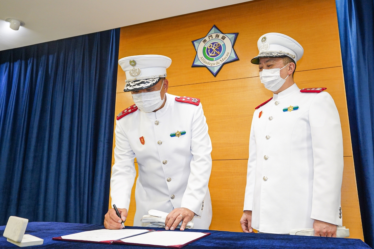 澳門海關今日(1日)下午於海關總部大樓舉行助理關長就職儀式,在海關領導和各部門主管的見證下,關務總長李煜輝進行宣誓及簽署就職狀,就任助理關長。