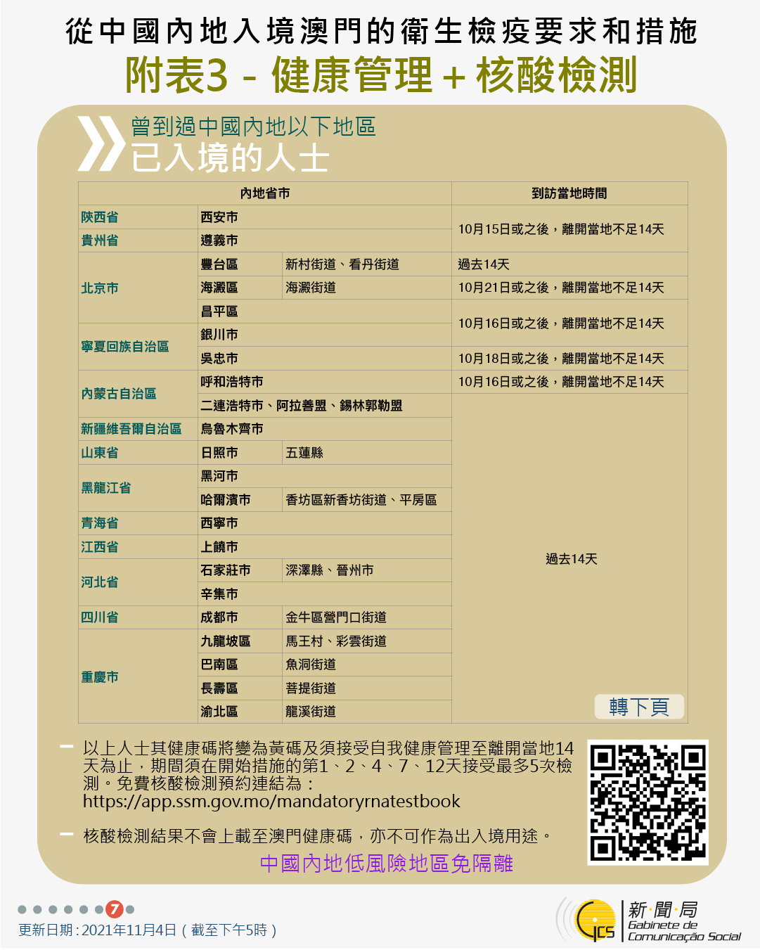 11月4日晚9時起曾到四川省和重慶市相關區域人士的防疫措施