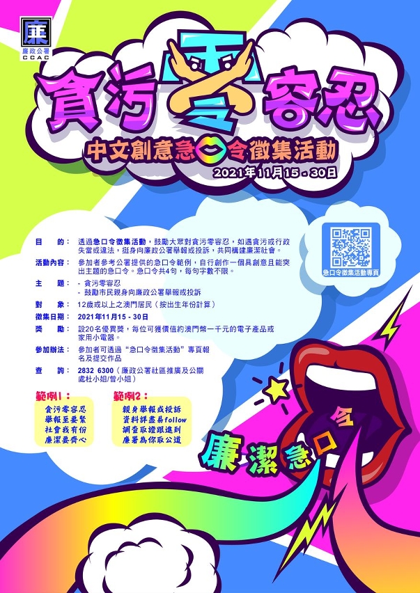 活動於11月15至30日舉行,歡迎12歲或以上澳門居民參加。市民可參考廉署提供的急口令範例,自行創作具創意且能突出活動主題的急口令。活動設20名優異獎,每位可獲價值約澳門幣一千元的電子產品或家用小電器。詳情可掃瞄徵集活動專頁二維碼或登入https://www.ccac.org.mo/events/tongue-twister瀏覽,查詢請電2832 6300與廉署社區推廣及公關處杜小姐聯絡。