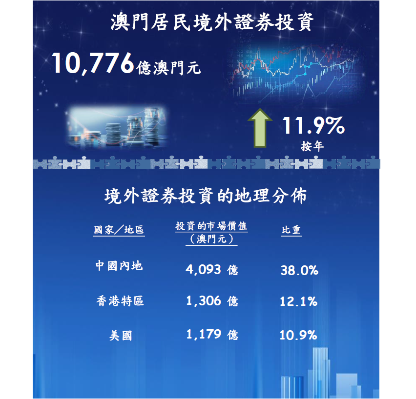 按地區劃分,亞洲仍佔澳門居民境外證券投資的最大比重,達55.7%,其餘則主要分佈在北大西洋和加勒比海(17.4%)、北美洲(12.4%)、歐洲(11.6%)及大洋洲(1.5%)等地。