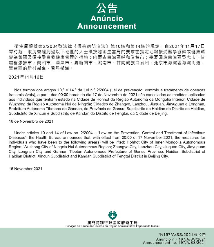 新型冠狀病毒感染應變協調中心(下稱“應變協調中心”)宣佈,因應内蒙古自治區、寧夏回族自治區、甘肅省及北京市的疫情變化,衛生局根據第2/2004號法律《傳染病防治法》第10條和第14條的規定,自2021年11月17日零時起,取消曾經到過以下地區的人士須按照衛生當局的要求在指定地點接受醫學觀察或健康碼變為黃碼及須接受自我健康管理的措施:内蒙古自治區呼和浩特市;寧夏回族自治區吳忠市;甘肅省張掖市、蘭州市、酒泉市、嘉峪關市、隴南市、甘南藏族自治州;北京市海淀區海淀街道,豐台區的新村街道、看丹街道。
