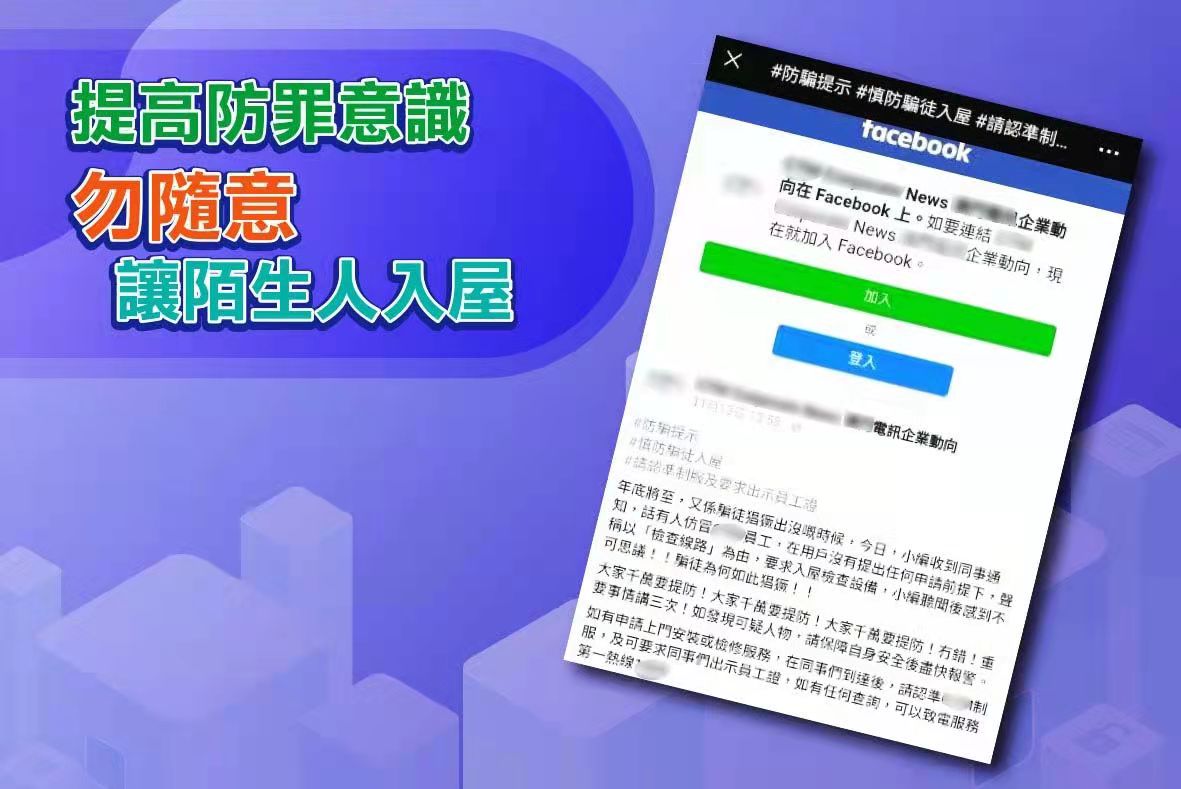 司法警察局接獲某電訊營運商舉報,指近日有人假冒公司職員,要求進入住戶家中檢查線路設備,涉事住戶懷疑來者的身份並果斷拒絕。