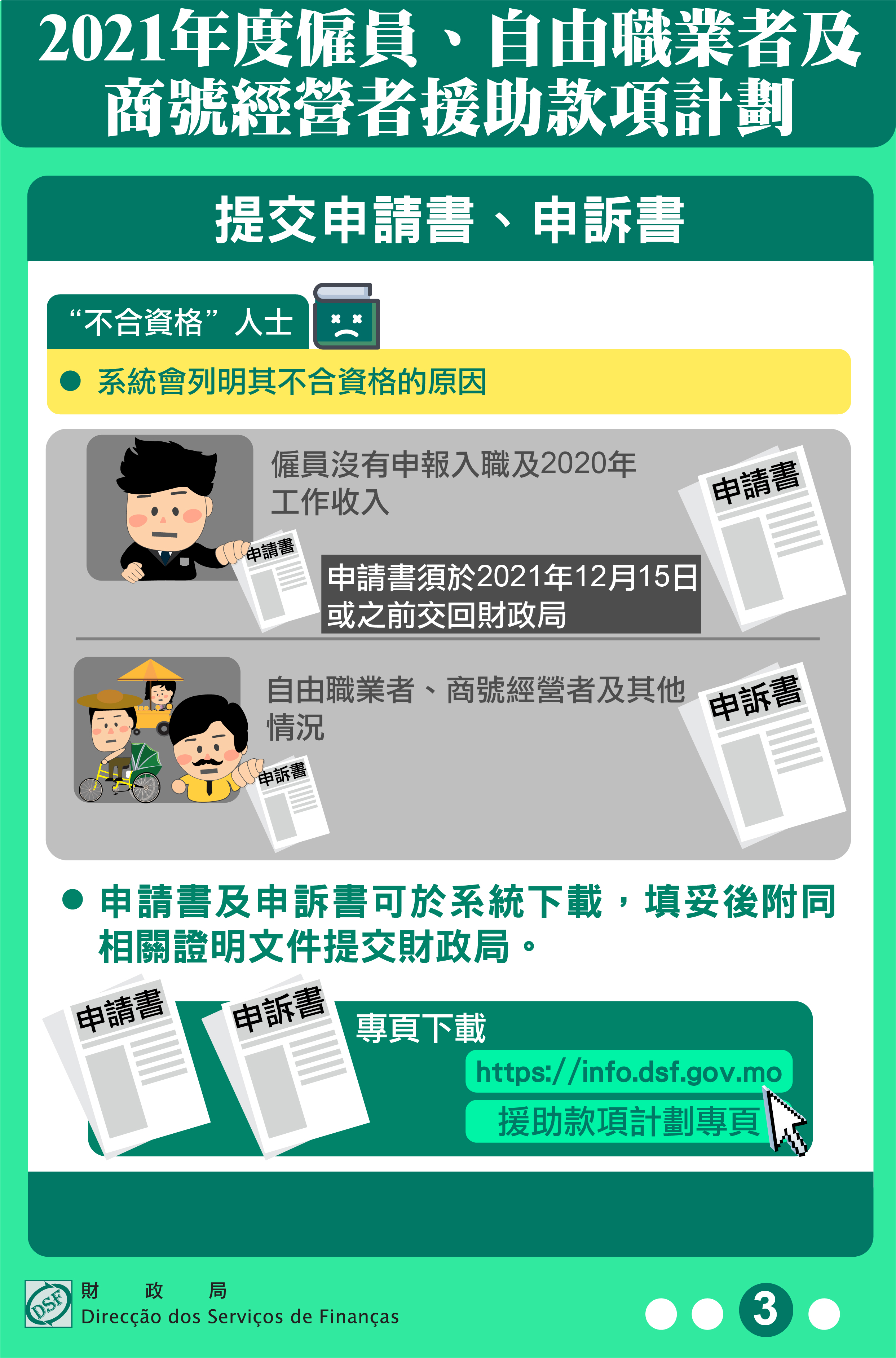 不合資格的僱員可透過申請,證明其於法規指定期間內確實存在僱傭關係且符合有關工作收入方面的規定,經財政局核實後,亦可獲發放僱員援助款項,有關申請書可於系統下載。