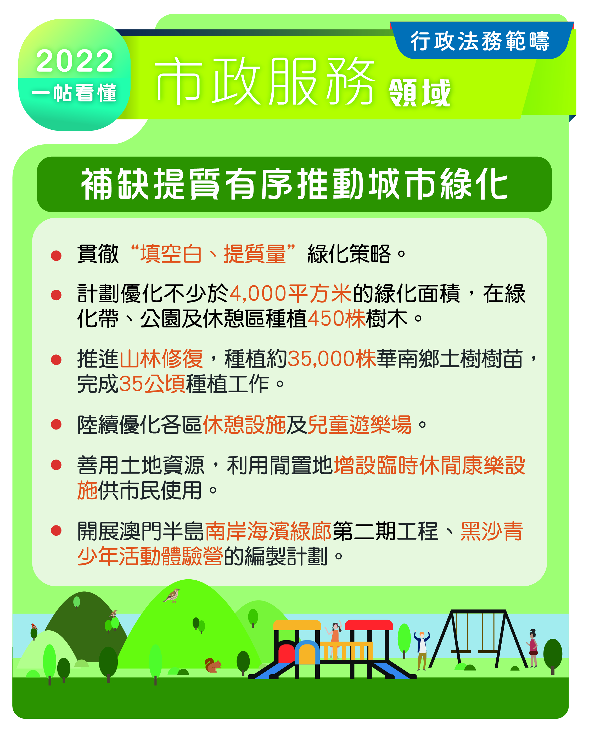2022行政法務範疇施政方針_市政服務領域_補缺提質有序推動城市綠化
