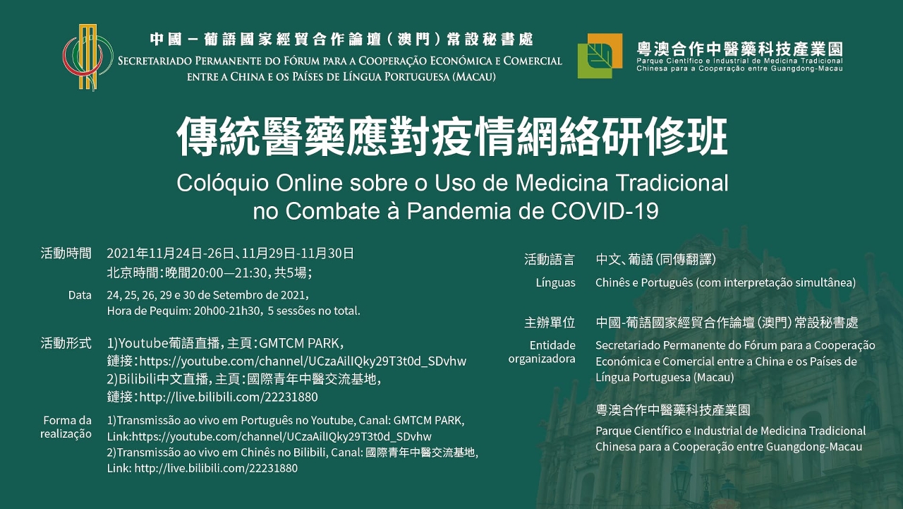 由中葡論壇(澳門)常設秘書處主辦、粵澳合作中醫藥科技產業園承辦、澳門衛生局及中國國家中醫藥管理局支持的“傳統醫藥應對疫情網絡研修班”於北京時間2021年11月24日20:00在線舉行開班儀式。中葡論壇(澳門)常設秘書處副秘書長丁恬、粵澳合作中醫藥科技產業園董事長兼行政總裁呂紅、莫桑比克衛生部副部長Lídia de Fátima da Graça Cardoso及葡語國家代表參加了線上開班儀式並致辭。