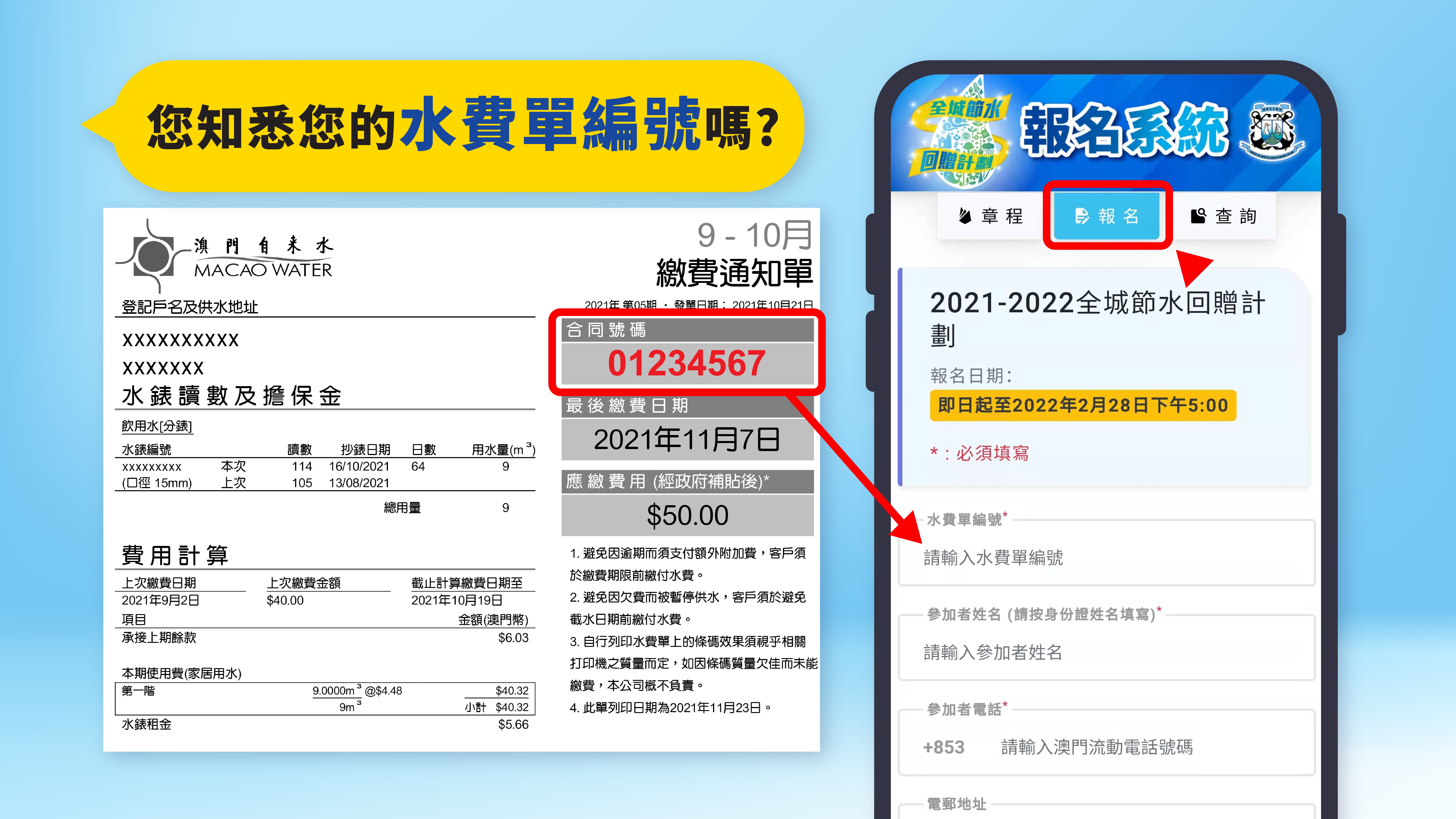 內地水利部門連續兩年評估今冬明春的水情較常年偏枯,珠江河口鹹潮上溯情況將較常年嚴重。為進一步增加居民主動節水的意識,今年海事及水務局對全民節水回贈計劃的參與流程作出調整,並加入抽獎環節。全澳的自來水用戶只要在澳門海事及水務局的微信公眾號,選擇“節水回贈計劃報名”一欄,在報名系統中輸入水費單編號(即合同號碼)、姓名和聯絡電話便可參加活動。