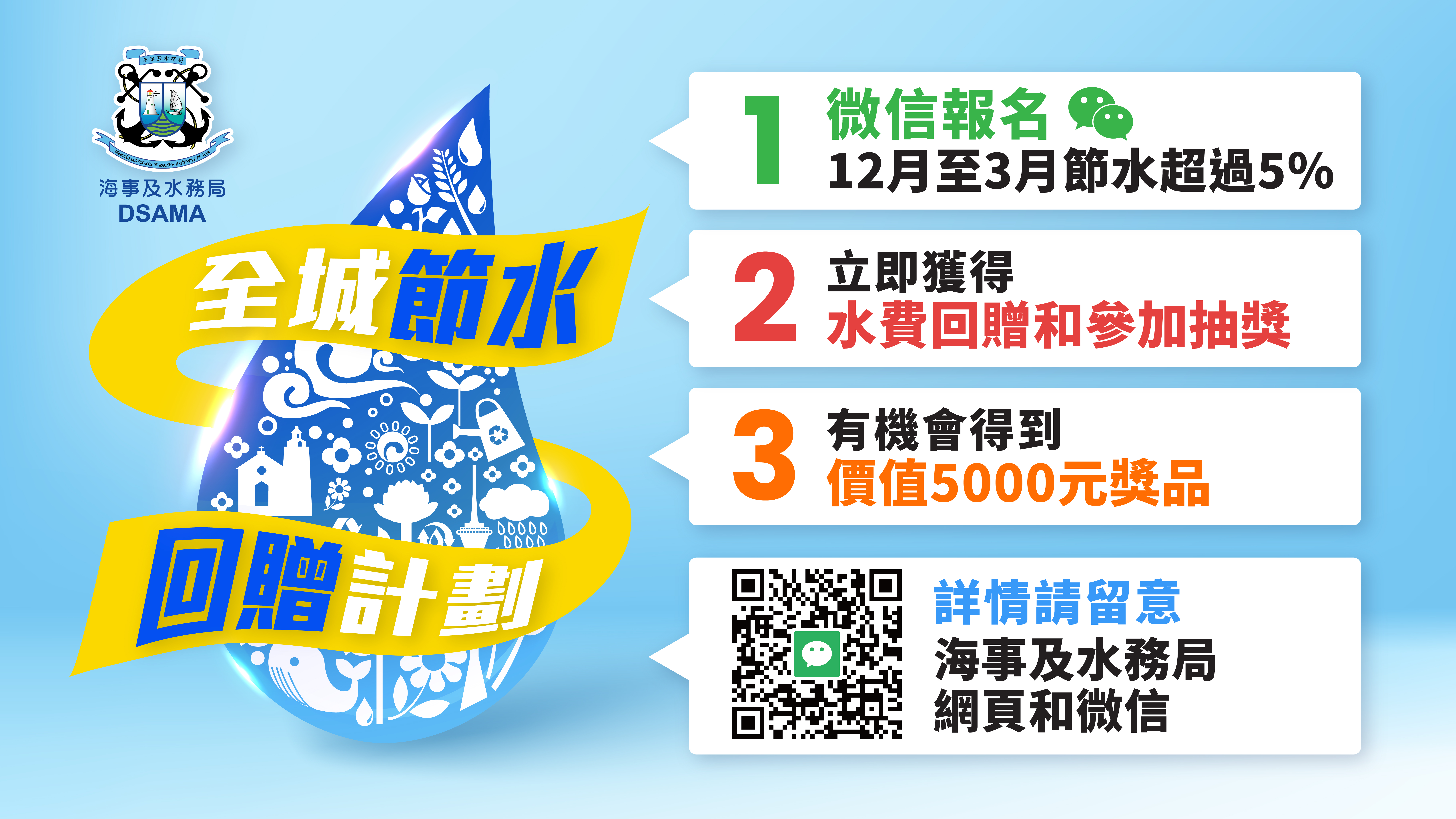 為推動全澳家庭及各行各業積極節約用水應對鹹潮威脅,海事及水務局再度推出全城節水回贈計劃鼓勵節約用水,用戶只要報名並達到節水目標,除了可獲水費回贈,還可自動參與抽獎,獎品豐富。活動由即日起接受報名至2月底。